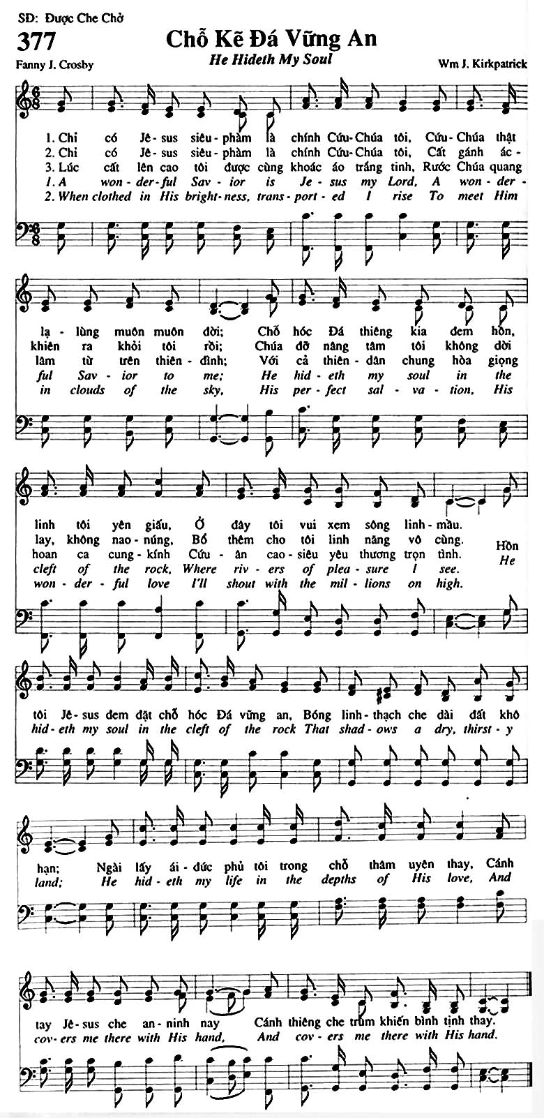 1. Chỉ có Jê-sus siêu phẩm là chính Cứu-Chúa tôi, Cứu-Chúa thật lạ lùng muôn muôn đời; Chỗ hóc Đá thiêng kia đem hồn, linh tôi yên giấu, Ở đây tôi vui xem sông linh-mầu. Hồn tôi Jê-sus đem đặt chỗ hóc Đá vững an, Bóng linh-thạch che dài đất khô hạn; Ngài lấy ái đức phủ tôi trong chỗ thâm uyên thay, Cánh tay Jê-sus che an ninh nay. 2. Chỉ có Jê-sus siêu phẩm là chính Cứu-Chúa tôi, Cất gánh ác khiên ra khỏi tôi rồi; Chúa đỡ nâng tâm tôi không dời lay, không nao-núg. Bổ thêm cho tôi linh năng vô cùng. Hồn tôi Jê-sus đem đặt chỗ hóc Đá vững an, Bóng linh-thạch che dài đất khô hạn; Ngài lấy ái đức phủ tôi trong chỗ thâm uyên thay, Cánh tay Jê-sus che an ninh nay. 3. Lúc cất lên cao tôi được cùng khoác áo trắng tinh, Rước Chúa quang lâm từ trên thiên-đình; Với cả thiên-dân chung hòa giọng hoan ca cung-kính Cứu-ân cao-siêu yêu thương trọn tình. Hồn tôi Jê-sus đem đặt chỗ hóc Đá vững an, Bóng linh-thạch che dài đất khô hạn; Ngài lấy ái đức phủ tôi trong chỗ thâm uyên thay, Cánh tay Jê-sus che an ninh nay. Điệp khúc: And covers me there with His hand, And covers me there with His hand.