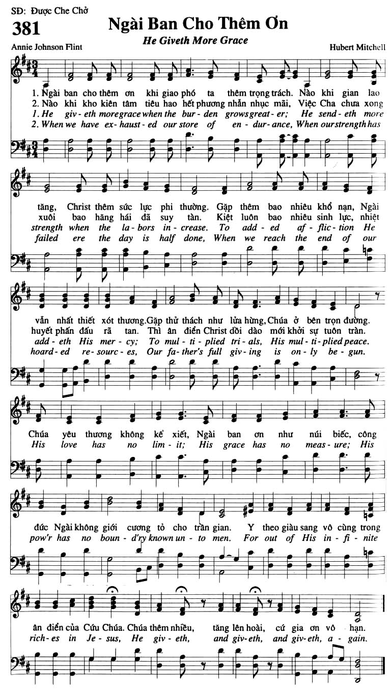 1. Ngài ban cho thêm ơn khi giao phó ta thêm trọng trách. Nào khi gian lao tăng, Christ thêm sức lực phi thường. Gặp thêm bao nhiêu khổ nạn, Ngài vẫn nhất thiết xót thương. Gặp thử thách như lửa hùng, Chúa ở bên trọn đường. 2. Nào khi kho kiên tâm tiêu hao hết phương nhẫn nhục mãi, Việc Cha chưa xong xuôi bao hăng hái đã suy tàn. Kiệt luôn bao nhiêu sinh lực, nhiệt huyết phấn đấu rã tan. Thì ân điển Christ dồi dào mới khởi sự tuôn tràn. Điệp khúc: Chúa yêu thương không kể xiết, Ngài ban ơn như núi biếc, công đức Ngài không giới cương tỏ cho trần gian. Y theo giàu sang vô cùng trong ân điển của Cứu Chúa. Chúa thêm nhiều, tăng lên hoài, cứ gia ơn vô hạn.