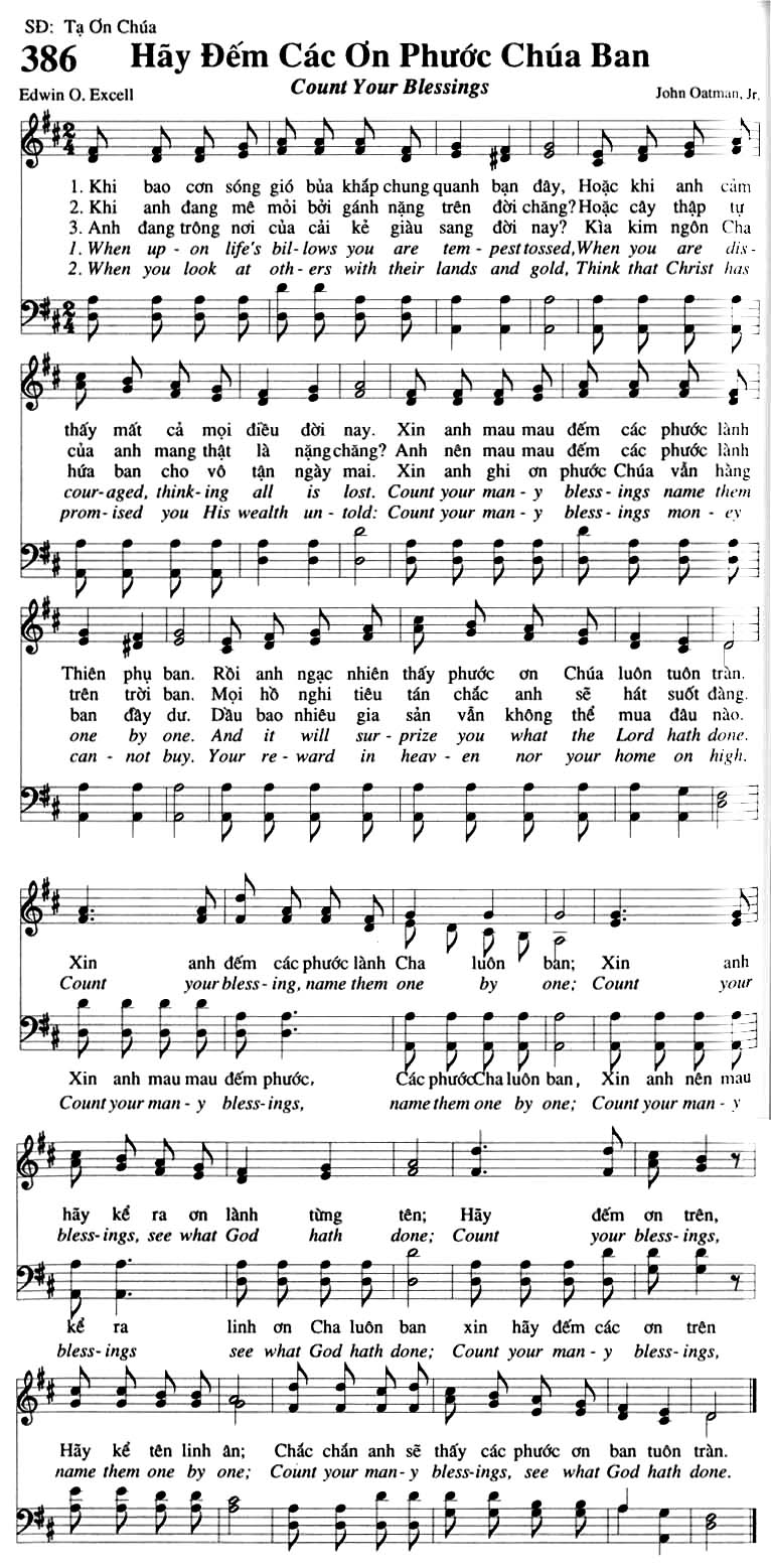 1. Khi bao cơn sóng gió bủa khắp chung quanh bạn đây, Hoặc khi anh cảm thấy mất cả mọi điều đời nay. Xin anh mau mau đếm các phước lành Thiên phụ ban. Rồi anh ngạc nhiên thấy phước ơn Chúa luôn tuôn tràn. 2. Khi anh đang mê mỏi bởi gánh nặng trên đời chăng? Hoặc cây thập tự của anh mang thật là nặng chăng? Anh nên mau mau đếm các phước lành trên trời ban. Mọi hồ nghi tiêu tán chắc anh sẽ hát suốt đàng. 3. Anh đang trông nơi của cải kẻ giàu sang đời nay? Kìa kim ngôn Cha hứa ban cho vô tận ngày mai. Xin anh ghi ơn phước Chúa vẫn hàng ban đầy dư. Dầu bao nhiêu gia sản vẫn không thể mua đâu nào. Điệp khúc: Xin anh đếm các phước lành Cha luôn ban; Xin anh hãy kể ra ơn lành từng tên; Hãy đếm ơn trên, Xin anh mau mau đếm phước, Các phước Cha luôn ban, Xin anh nên mau hãy kể tên linh ân; Chắc chắn anh sẽ thấy các phước ơn ban tuôn tràn.