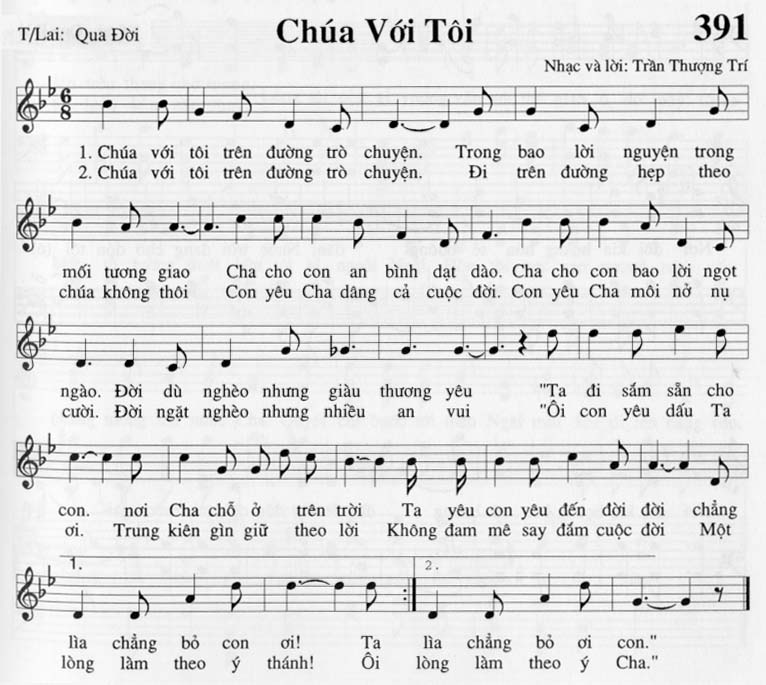 1. Chúa với tôi trên đường trò chuyện. Trong bao lời nguyện trong mối tương giao Cha cho con an bình dạt dào. Cha cho con bao lời ngọt ngào. Đời dù nghèo nhưng giàu thương yêu "Ta đi sắm sẵn cho con. nơi Cha chỗ ở trên trời Ta yêu con yêu đến đời đời chẳng lìa chẳng bỏ con ơi!" 2. Chúa với tôi trên đường trò chuyện. Đi trên đường hẹp theo chúa không thôi Con yêu Cha dâng cả cuộc đời. Con yêu Cha môi nở nụ cười. Đời ngặt nghèo nhưng nhiều an vui "Ôi con yêu dấu Ta ơi. Trung kiên gìn giữ theo lời Không đam mê say đắm cuộc đời Một lòng làm theo ý thánh! Ôi lòng làm theo ý Cha."