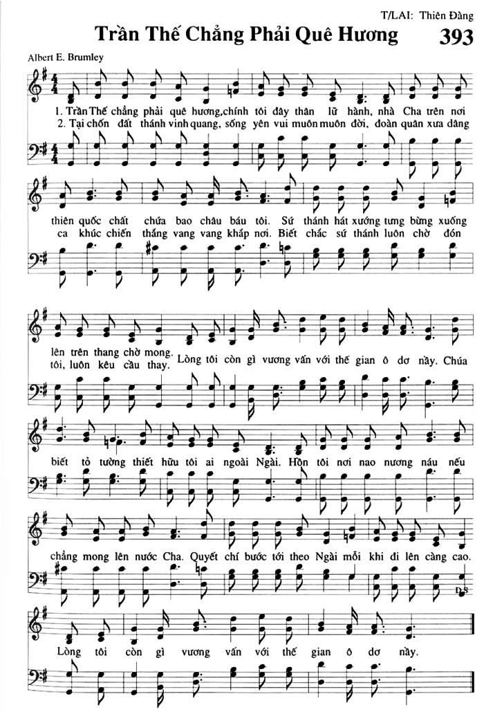 1. Trần Thế chẳng phải quê hương, chính tôi đây thân lữ hành, nhà Cha trên nơi thiên quốc chất chứa bao châu báu tôi. Sứ thánh hát xướng tưng bừng xuống lên trên thang chờ mong. Lòng tôi còn gì vương vấn với thế gian ô dơ này. Chúa biết tỏ tường thiết hữu tôi ai ngoài Ngài. Hồn tôi nơi nao nương náu nếu chẳng mong lên nước Cha. Quyết chí bước tới theo Ngài mỗi khi đi lên càng cao. Lòng tôi còn gì vương vấn với thế gian ô dơ này. 2. Tại chốn đất thánh vinh quang, sống yên vui muôn muôn đời, đoàn quân xưa dâng ca khúc chiến thắng vang vang khắp nơi. Biết chắc sứ thánh luôn chờ đón tôi, luôn kêu cầu thay.