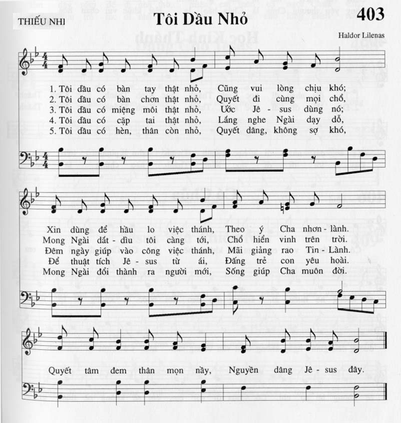 1. Tôi dầu có bàn tay thật nhỏ, Cũng vui lòng chịu khó; Xin dùng để hầu lo việc thánh, Theo ý Cha nhơn - lành. Quyết tâm đem thân mọn nầy, Nguyền dâng Jê - sus đây. 2. Tôi dầu có bàn chơn thật nhỏ, Quyết đi cùng mọi chổ, Mong Ngài dắt - dìu tôi càng tới, Chổ hiển vinh trên trời. Quyết tâm đem thân mọn nầy, Nguyền dâng Jê - sus đây. 3. Tôi dầu có miệng môi thật nhỏ, Ước Jê - sus dùng nó; Đêm ngày giúp vào công việc thánh, Mãi giảng rao Tin - Lành. Quyết tâm đem thân mọn nầy, Nguyền dâng Jê - sus đây. 4. Tôi dầu có cặp tai thật nhỏ, Lắng nghe Ngài dạy dỗ, Để thuật tích Jê - sus từ ái, Đấng trẻ con yêu hoài. Quyết tâm đem thân mọn nầy, Nguyền dâng Jê - sus đây. 5. Tôi dầu có hèn, thân còn nhỏ, Quyết dâng, không sợ khó, Mong Ngài đổi thành ra người mới, Sống giúp Cha muôn đời. Quyết tâm đem thân mọn nầy, Nguyền dâng Jê - sus đây.
