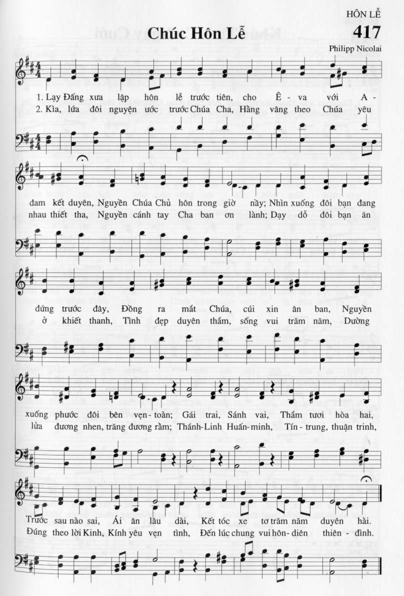 1. Lạy Đấng xưa lập hôn lễ trước tiên, cho Ê-va với A-đam kết duyên, Nguyền Chúa Chủ hôn trong giờ nầy; Nhìn xuống đôi bạn đang đứng trước đây, Đồng ra mắt Chúa, cúi xin ân ban, Nguyền xuống phước đôi bên vẹn-toàn; Gái trai, Sánh vai, Thắm tươi hòa hai, Trước sau nào sai, Ái ân lâu dài, Kết tóc xe tơ trăm năm duyên hài. 2. Kìa, lứa đôi nguyện ước trước Chúa Cha, Hằng vâng theo Chúa yêu nhau thiết tha, Nguyền cánh tay Cha ban ơn lành; Dạy dỗ đôi bạn ăn ở khiết thanh, Tình đẹp duyên thắm, sống vui trăm năm, Dường lửa đương nhen, trăng đương rằm; Thánh-Linh Huấn-minh, Tín - trung, thuận trinh, Đúng theo lời Kinh, Kính yêu vẹn tình, Đến lúc chung vui hôn-diên thiên - đình.
