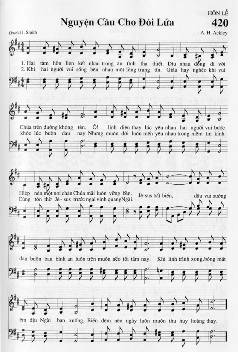 1. Hai tâm hồn liên kết nhau trong ân tình tha thiết. Dìu nhau đồng đi với Chúa trên đường không tên. Ô! linh diệu thay lúc yêu nhau hai người vui bước Hiệp nên một nơi chân Chúa mãi luôn vững bền. Jê-sus bất biến, đau buồn ban bình an luôn trên muôn nẽo tối tăm nay. Khi linh trình xong, bóng mát êm dịu Ngài ban xuống, Biến đêm nên ngày luôn muôn thu huy hoàng thay. 2. Khi hai người vui sống bên nhau một lòng trung tín. Giàu hay nghèo khi vui khỏe lúc buồn đau nay. Nhưng muôn đời luôn mến yêu nhau trong niềm tin kính Cùng tôn thờ Jê-sus trước ngai vinh quang Ngài.