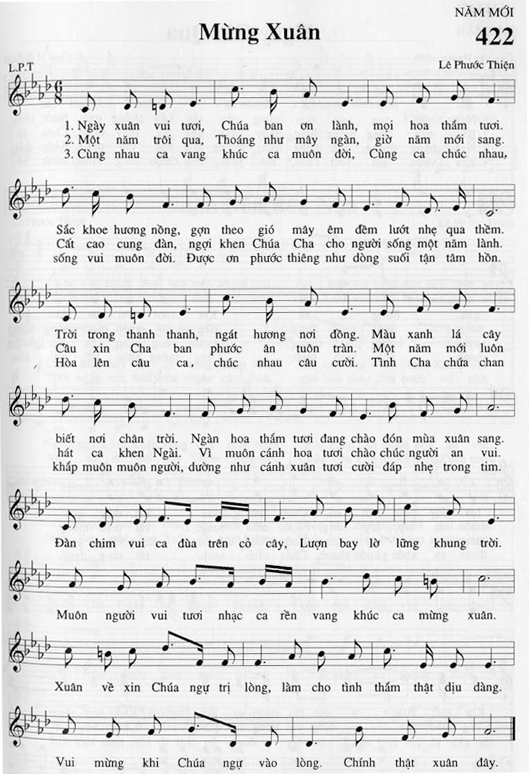 1. Ngày xuân vui tươi, Chúa ban ơn lành, mọi hoa thắm tươi. Sắc khoe hương nồng, gợn theo gió mây êm đềm lướt nhẹ qua thềm. Trời trong thanh thanh, ngát hương nơi đồng. Màu xanh lá cây biết nơi chân trời. Ngàn hoa thắm tươi đang chào đón mùa xuân sang. Đàn chim vui ca đùa trên cỏ cây, Lượn bay lờ lững khung trời. Muôn người vui tươi nhạc ca rền vang khúc ca mừng xuân. Xuân về xin Chúa ngự trị lòng, làm cho tình thấm thật dịu dàng. Vui mừng khi Chúa ngự vào lòng. Chính thật xuân đây. 2. Một năm trôi qua, Thoáng như mây ngàn, giờ năm mới sang. Cất cao cung đàn, ngợi khen Chúa Cha cho người sống một năm lành. Câu xin Cha ban phước ân tuôn tràn. Một năm mới luôn hát ca khen Ngài. Vì muôn cánh hoa tươi chào chúc người an vui. 3. Cùng nhau ca vang khúc ca muôn đời, Cùng ca chúc nhau, sống vui muôn đời. Được ơn phước thiêng như dòng suối tận tâm hồn. Hòa lên câu ca, chúc nhau câu cười. Tình Cha chứa chan khắp muôn muôn người, dường như cánh xuân tươi cười đáp nhẹ trong tim.