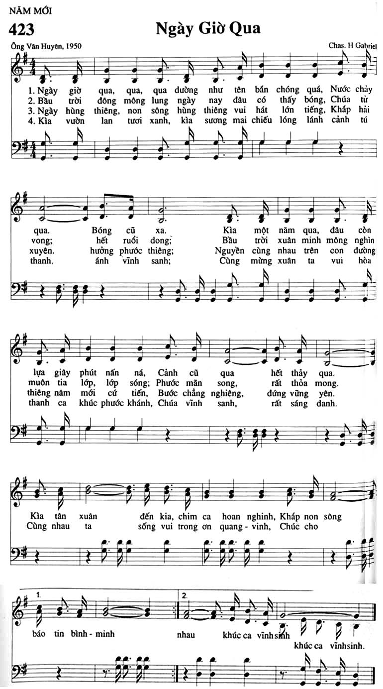 1. Ngày giờ qua, qua, qua dường như tên bắn chóng quá, Nước chảy qua. Bóng cũ xa. Kìa một năm qua, đâu còn lựa giây phút nấn ná, Cảnh cũ qua hết thảy qua. Kìa tân xuân đến kia, chim ca hoan nghinh, Khắp non sông báo tin bình - minh khúc ca vĩnh sinh. 2. Bầu trời đông mông lung ngày nay đâu có thấy bóng, Chúa từ vong; hết ruổi dong; Bầu trời xuân minh mông nghìn muôn tia lớp, lớp sóng; Phước mãn song, rất thỏa mong. Cùng nhau ta sống vui trong ơn quang - vinh, Chúc cho nhau khúc ca vĩnh sinh. 3. Ngày hùng thiêng, non sông hùng thiêng vui hát lớn tiếng, Khắp hải xuyên. hưởng phước thiêng; Nguyền cùng nhau trên con đường thiêng năm mới cứ tiến, Bước chẳng nghiêng, đứng vững yên. Cùng mừng xuân ta vui hòa khúc ca vĩnh sinh. 4. Kìa vườn lan tươi xanh, kìa sương mai chiếu lóng lánh cảnh tú thanh. ánh vĩnh sanh; Cùng mừng xuân ta vui hòa thanh ca khúc phước khánh, Chúa vĩnh sanh, rất sáng danh. khúc ca vĩnhsinh.