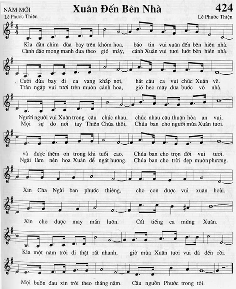 1. Kìa đàn chim đùa bay trên khóm hoa, báo tin vui xuân đến bên hiên nhà. Cành đào mong manh đưa theo gió mây, cánh Xuân vui tươi lướt bên hiên nhà. Cười đùa bay đi ca vang khắp nơi, hát câu ca vui chúc Xuân về. Tràn ngập vui tươi trên muôn cánh hoa, gió heo mây đưa bước vô nhà. 2. Người người vui Xuân trong câu chúc nhau, chúc nhau câu thuận hòa an vui, Mọi sự do nơi tay Thiên Chúa thôi, Chúa ban cho người mùa Xuân tươi. và được thêm ơn trong khi tuổi cao. Chúa ban cho trọn đời vui tươi. Ngài làm nên hoa Xuân để ngát hương. Chúa ban cho trời đẹp muôn phương. 3. Xin Cha Ngài ban phước thiêng, cho con được vui xuân hoài. Xin cho được may mắn luôn. Cất tiếng ca mừng Xuân. Kìa một năm trôi đi thật rất nhanh, giờ mùa Xuân tươi vui đã đến rồi. Mọi buồn đau xin trôi theo tháng năm. Cầu nguồn Phước trong tôi.