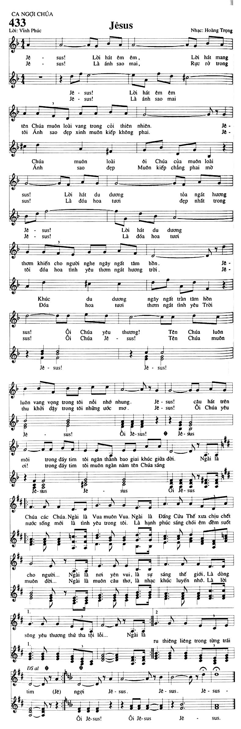 1. Jê-sus! Lời hát êm êm, Lời hát mang Rực rỡ trong tên Chúa muôn loài vang trong cỏi thiên nhiên. Ôi Chúa của muôn loài. Jê-sus! Lời hát du dương tỏa ngát hương thơm khiến cho người nghe ngây ngất tâm hồn. Khúc du dương ngây ngất trần tâm hồn. Jê-sus! Ôi Chúa yêu thương! Tên Chúa luôn vang vọng trong tôi nỗi nhớ nhung. Jê-sus! câu hát trên môi trong đáy tim tôi ngân thành bao giai khúc giữa đời. Ngài là Chúa các Chúa. Ngài là Vua muôn Vua. Ngài là Đấng Cứu Thế xưa chịu chết cho người... Ngài là nơi yên vui, là sự sáng thế giới. Là dòng sông yêu thương thứ tha tội lỗi... Ngài là ru thiêng liêng trong từng trái tim ngợi Jê-sus. Jê-sus. Jê-sus. 2. Jê-sus! Là ánh sao mai, Là ánh sao đẹp xinh muôn kiếp không phai. Ánh sao đẹp Muôn kiếp chẳng phai mờ. Jê-sus! Là đóa hoa tươi đẹp nhất trong tôi đóa hoa tình yêu thơm ngát hương trời. Đóa hoa tươi thơm ngát tình yêu Trời. Jê-sus! Ôi Chúa Jê-sus! Tên Chúa muôn thu khởi dậy trong tôi những ước mơ. Jê-sus! Ôi Chúa yêu ơi! trong đáy tim tôi muôn ngàn năm tên Chúa sáng. Ôi Jê-sus! Ngài là nước sống mới là tình yêu trong tôi. Là hạnh phúc sáng chói êm đềm suốt muôn đời... Ngài là muôn câu thơ, là nhạc khúc luyến nhớ. Là lời Ôi Jê-sus! Ôi Jê-sus! Jê-sus.