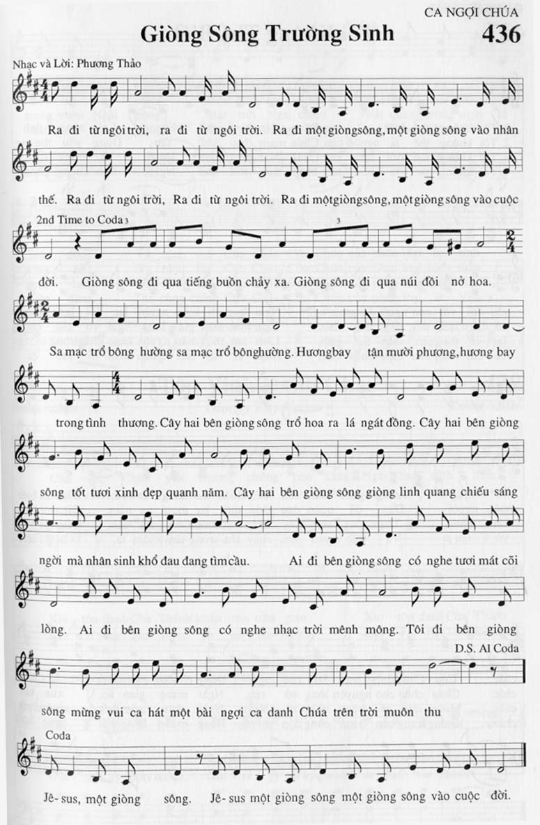 1. Ra đi từ ngôi trời, ra đi từ ngôi trời. Ra đi một giòng sông, một giòng sông vào nhân thế. Ra đi từ ngôi trời, Ra đi từ ngôi trời. Ra đi một giòng sông, một giòng sông vào cuộc đời. Giòng sông đi qua tiếng buồn chảy xa. Giòng sông đi qua núi đồi nở hoa. Sa mạc trổ bông hường sa mạc trổ bông hường. Hương bay tận mười phương, hương bay trong tình thương. Cây hai bên giòng sông trổ hoa ra lá ngát đồng. Cây hai bên giòng sông tốt tươi xinh đẹp quanh năm. Cây hai bên giòng sông giòng linh quang chiếu sáng ngời mà nhân sinh khổ đau đang tìm cầu. Ai đi bên giòng sông có nghe tươi mát cõi lòng. Ai đi bên giòng sông có nghe nhạc trời mênh mông. Tôi đi bên giòng sông mừng vui ca hát một bài ngợi ca danh Chúa trên trời muôn thu. 2. Jê-sus, một giòng sông. Jê-sus một giòng sông một giòng sông vào cuộc đời.