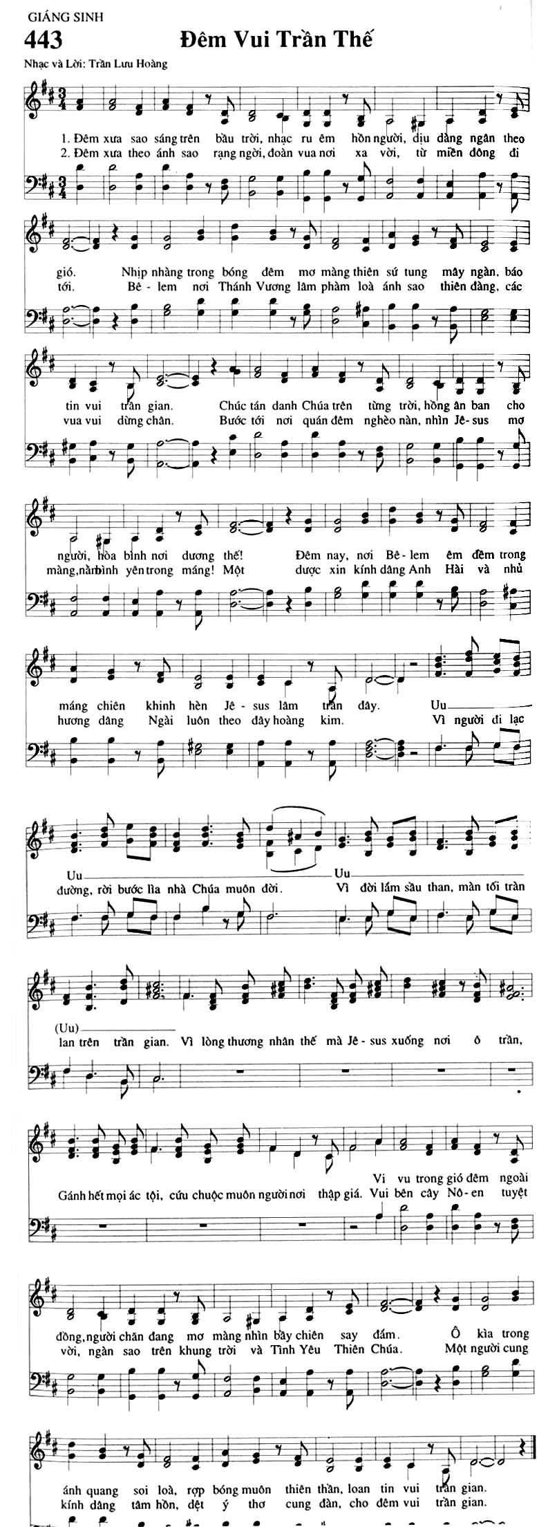 1. Đêm xưa sao sáng trên bầu trời, nhạc ru êm hồn người, dịu dàng ngân theo gió. Nhịp nhàng trong bóng đêm mơ màng thiên sứ tung mây ngàn, báo tin vui trần gian. Chúc tán danh Chúa trên từng trời, hồng ân ban cho người, hòa bình nơi dương thế! Đêm nay, nơi Bê-lem êm đêm trong máng chiên khinh hèn Jê-sus lâm trần đây. Uu... Vì người đi lạc đường, rời bước lìa nhà Chúa muôn đời. Uu... Vì đời lắm sầu than, màn tối tràn lan trên trần gian. Vì lòng thương nhân thế mà Jê-sus xuống nơi ở trần, Gánh hết mọi ác tội, cứu chuộc muôn người nơi thập giá. Vui bên cây Nô-en tuyệt đồng, người chăn đang mơ màng nhìn bầy chiên say đắm. Ô kìa trong ánh quang soi loà, rợp bóng muôn thiên thần, loan tin vui trần gian. 2. Đêm xưa theo ánh sao rạng ngời, đoàn vua nơi xa vời, từ miền đông đi tới. Bê-lem nơi Thánh Vương lâm phàm loà ánh sao thiên đàng, các vua vui dừng chân. Bước tới nơi quán đêm nghèo nàn, nhìn Jê-sus mơ màng, nằrbình yên trong máng! Một được xin kính dâng Anh Hài và nhủ hương dâng Ngài luôn theo dây hoàng kim. Uu... Vì người đi lạc đường, rời bước lìa nhà Chúa muôn đời. Uu... Vì đời lắm sầu than, màn tối tràn lan trên trần gian. Vì lòng thương nhân thế mà Jê-sus xuống nơi ở trần, Gánh hết mọi ác tội, cứu chuộc muôn người nơi thập giá. Vui bên cây Nô-en tuyệt vời, ngàn sao trên khung trời và Tình Yêu Thiên Chúa. Một người cung kính dâng tâm hồn, dệt ý thơ cung đàn, cho đêm vui trần gian.