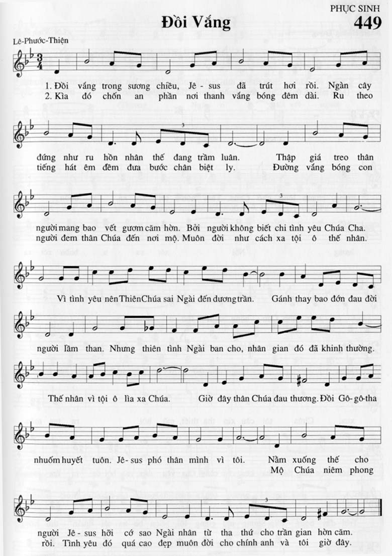 1. Đồi vắng trong sương chiều, Jê-sus đã trút hơi rồi. Ngàn cây đứng như ru hồn nhân thế đang trầm luân. Thập giá treo thân người mang bao vết gươm căm hờn. Bởi người không biết chi tình yêu Chúa Cha. Vì tình yêu nên Thiên Chúa sai Ngài đến dương trần. Gánh thay bao đớn đau đời người lầm than. Nhưng thiên tình Ngài ban cho, nhân gian đó đã khinh thường. Thế nhân vì tội ô lìa xa Chúa. Giờ đây thân Chúa đau thương. Đồi Gô-gô-tha nhuốm huyết tuôn. Jê-sus phó thân mình vì tôi. Nằm xuống thế cho người Jê-sus hỡi cớ sao Ngài nhân từ tha thứ cho trần gian hờn căm. 2. Kìa đó chốn an phần nơi thanh vắng bóng đêm dài. Ru theo tiếng hát êm đềm đưa bước chân biệt ly. Đường vắng bóng con người đem thân Chúa đến nơi mộ. Muôn đời như cách xa tội ô thế nhân. Vì tình yêu nên Thiên Chúa sai Ngài đến dương trần. Gánh thay bao đớn đau đời người lầm than. Nhưng thiên tình Ngài ban cho, nhân gian đó đã khinh thường. Thế nhân vì tội ô lìa xa Chúa. Giờ đây thân Chúa đau thương. Đồi Gô-gô-tha nhuốm huyết tuôn. Jê-sus phó thân mình vì tôi. Mộ Chúa niêm phong rồi. Tình yêu đó quá cao đẹp muôn đời cho chính anh và tôi giờ đây.