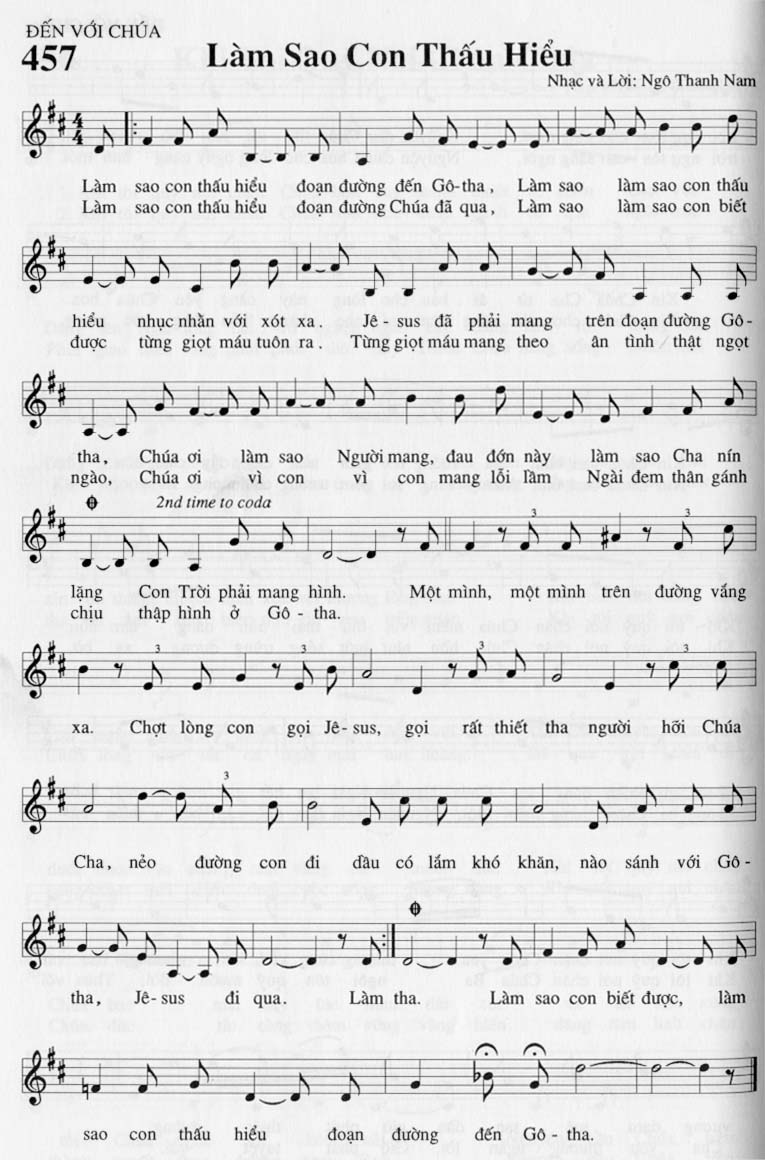 1. Làm sao con thấu hiểu đoạn đường đến Gô-tha, Làm sao làm sao con thấu hiểu nhục nhằn với xót xa. Jê-sus đã phải mang trên đoạn đường Gô-tha, Chúa ơi làm sao Người mang, đau đớn này làm sao Cha nín lặng Con Trời phải mang hình. Một mình, một mình trên đường vắng xa. Chợt lòng con gọi Jê-sus, gọi rất thiết tha người hỡi Chúa Cha, nẻo đường con đi đâu có lắm khó khăn, nào sánh với Gô-tha, Jê-sus đi qua. Làm tha. Làm sao con biết được, làm sao con thấu hiểu đoạn đường đến Gô-tha. 2. Làm sao con thấu hiểu đoạn đường Chúa đã qua, Làm sao làm sao con biết được từng giọt máu tuôn ra. Từng giọt máu mang theo ân tình thật ngọt ngào, Chúa ơi vì con vì con mang lỗi lầm Ngài đem thân gánh chịu thập hình ở Gô - tha. Chợt lòng con gọi Jê-sus, gọi rất thiết tha người hỡi Chúa Cha, nẻo đường con đi đâu có lắm khó khăn, nào sánh với Gô-tha, Jê-sus đi qua. Làm tha. Làm sao con biết được, làm sao con thấu hiểu đoạn đường đến Gô-tha.