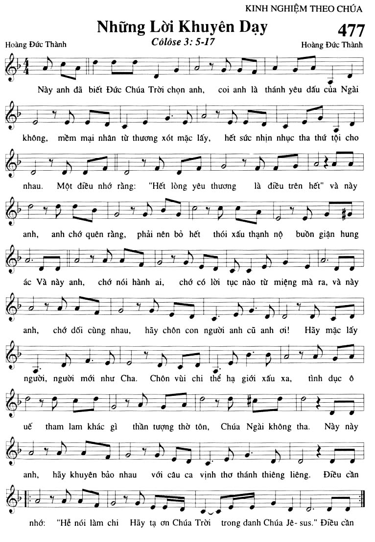1. Này anh đã biết Đức Chúa Trời chọn anh, coi anh là thánh yêu dấu của Ngài không, mềm mại nhân từ thương xót mặc lấy, hết sức nhịn nhục tha thứ tội cho nhau. Một điều nhớ rằng: "Hết lòng yêu thương là điều trên hết" và này anh, anh chớ quên rằng, phải nên bỏ hết thói xấu thạnh nộ buồn giận hung ác Và này anh, chớ nói hành ai, chớ có lời tục nào từ miệng mà ra, và này anh, chớ dối cùng nhau, hãy chôn con người anh cũ anh ơi! Hãy mặc lấy người, người mới như Cha. Chôn vùi chi thể hạ giới xấu xa, tình dục ô uế tham lam khác gì thần tượng thờ tôn, Chúa Ngài không tha. Này này anh, hãy khuyên bảo nhau với câu ca vịnh thơ thánh thiêng liêng. Điều cần nhớ: "Hễ nói làm chi Hãy tạ ơn Chúa Trời trong danh Chúa Jê-sus." Điều cần