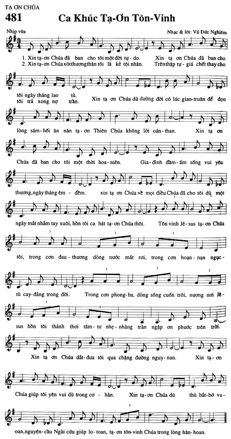 1. Xin tạ ơn Chúa đã ban cho tôi một đời tự do. Xin tạ ơn Chúa đã ban cho tôi ngày tháng lao tù. Xin tạ ơn Chúa dù đường đời có lúc gian truân để dọn lòng sám hối ăn năn tạ ơn Thiên Chúa không lời oán than. Xin tạ ơn Chúa đã ban cho tôi một thời hoa niên. Gia đình đầm ấm sống vui yêu thương, ngày tháng êm đềm. Xin tạ ơn Chúa về mọi điều Chúa đã cho tôi dù một ngày mắt nhắm tay xuôi, hồn tôi ca hát tạ ơn Chúa thôi. Tôn vinh Jê-sus tạ ơn Chúa tôi, trong cơn đau thương dòng nước mắt rơi, trong cơn hoạn nạn ngục tù cay đắng trong đời. Trong cơn phong ba, dòng sông cuốn trôi, nương nơi Jê-sus hồn tôi thảnh thơi tâm tư nhẹ nhàng tràn ngập ơn phước trên trời. Xin tạ ơn Chúa dắt đưa tôi qua chặng đường nguy nan. Xin tạ ơn Chúa giúp tôi yên vui dù trong cơ hàn. Xin tạ ơn Chúa dù thù bắt bớ vu oan, nguyện cầu Ngài cứu giúp lo toan, tạ ơn tôn vinh Chúa trong lòng hân hoan. 2. Xin tạ ơn Chúa xót thương thân tôi là kẻ tội nhân. Trên thập tự giá chết thay cho tôi trả xong nợ trần. Xin tạ ơn Chúa dù đường đời có lúc gian truân để dọn lòng sám hối ăn năn tạ ơn Thiên Chúa không lời oán than. Xin tạ ơn Chúa đã ban cho tôi một thời hoa niên. Gia đình đầm ấm sống vui yêu thương, ngày tháng êm đềm. Xin tạ ơn Chúa về mọi điều Chúa đã cho tôi dù một ngày mắt nhắm tay xuôi, hồn tôi ca hát tạ ơn Chúa thôi. Tôn vinh Jê-sus tạ ơn Chúa tôi, trong cơn đau thương dòng nước mắt rơi, trong cơn hoạn nạn ngục tù cay đắng trong đời. Trong cơn phong ba, dòng sông cuốn trôi, nương nơi Jê-sus hồn tôi thảnh thơi tâm tư nhẹ nhàng tràn ngập ơn phước trên trời. Xin tạ ơn Chúa dắt đưa tôi qua chặng đường nguy nan. Xin tạ ơn Chúa giúp tôi yên vui dù trong cơ hàn. Xin tạ ơn Chúa dù thù bắt bớ vu oan, nguyện cầu Ngài cứu giúp lo toan, tạ ơn tôn vinh Chúa trong lòng hân hoan.