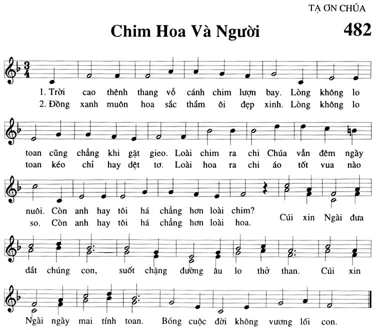 1. Trời cao thênh thang vỗ cánh chim lượn bay. Lòng không lo toan cũng chẳng khi gặt gieo. Loài chim ra chi Chúa vẫn đêm ngày nuôi. Còn anh hay tôi há chẳng hơn loài chim? Cúi xin Ngài đưa dắt chúng con, suốt chặng đường âu lo thở than. Cúi xin Ngài ngày mai tính toan. Bóng cuộc đời không vương lối con. 2. Đồng xanh muôn hoa sắc thắm ôi đẹp xinh. Lòng không lo toan kéo chỉ hay dệt tơ. Loài hoa ra chi áo tốt vua nào so. Còn anh hay tôi há chẳng hơn loài hoa.