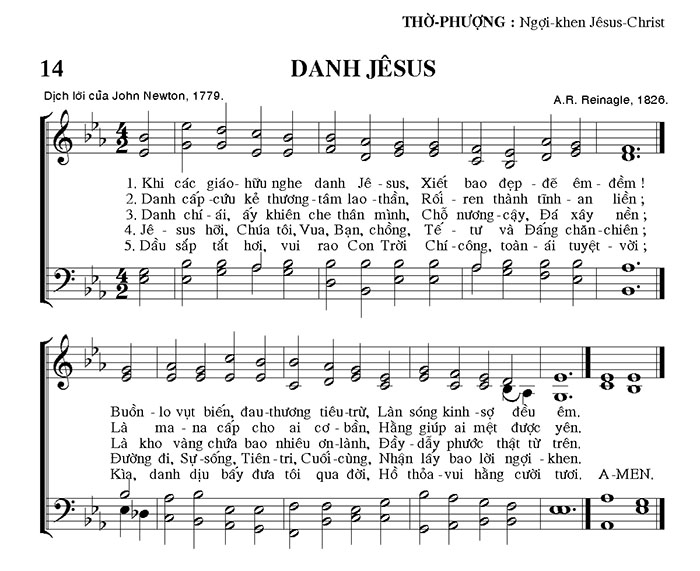 1. Khi các giáo-hữu nghe danh Jê-sus, Xiết bao đẹp-đẽ êm-đềm! Buồn-lo vụt biến, đau-thương tiêu-trừ, Làn sóng kinh-sợ đều êm. 2. Danh cấp-cứu kẻ thương-tâm lao-thân, Rồi-ren thành tĩnh-an liền; Là ma-na cấp cho ai cơ-bần, Hằng giúp ai mệt được yên. 3. Danh chí-ái, ấy khiến che thân mình, Chỗ nương-cậy, Đá xây nền; Là kho vàng chứa bao nhiêu ơn-lành, Đầy-dẫy phước thật từ trên. 4. Jê-sus hỡi, Chúa tôi, Vua, Bạn, chồng, Tế-tư và Đấng chăn-chiên; Đường đi, Sự-sống, Tiên-tri, Cuối-cùng, Nhận lấy bao lời ngợi-khen. 5. Dầu sắp tắt hơi, vui rao Con Trời Chí-công, toàn-ái tuyệt-vời; Kìa, danh dịu bây đưa tôi qua đời, Hồ thỏa-vui hằng cười tươi. A-MEN.