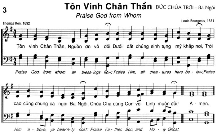 1. Tôn vinh Chân Thần, Nguồn ơn vô đối, Dưới đất chúng sinh tụng mỹ khắp nơi, Trời cao cũng chung ca ngợi Ba Ngôi, Chúa Cha cùng Con với Linh muôn đời! A-men.