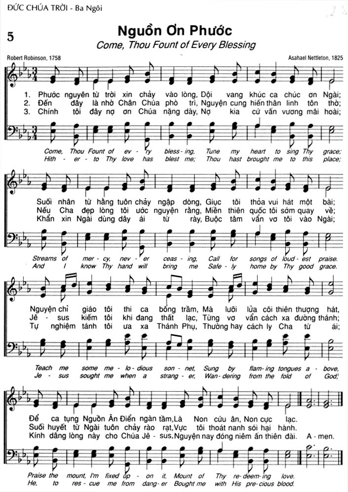 1. Phước nguyên từ trời xin chảy vào lòng, Dội vang khúc ca chúc ơn Ngài; Suối nhân từ hằng tuôn chảy ngập dòng, Giục tôi thỏa vui hát một bài; Nguyện chỉ giáo tôi thi ca bồng trầm, Mà lưỡi lửa cõi thiên thượng hát, Để ca tụng Nguồn Ân Điển ngàn tầm, Là Non cứu ân, Non cực lạc. 2. Đến đây là nhờ Chân Chúa phò trì, Nguyện cung hiến thân linh tôn thờ; Nếu Cha đẹp lòng tôi ước nguyện rằng, Miền thiên quốc tôi sớm quay về; Jê-sus kiếm tôi khi đang thất lạc, Từng vơ vẫn cách xa đường thánh; Suối huyết từ Ngài tuôn chảy rào rạt, Vực tôi thoát nanh sói hại hành. 3. Chính tôi đây nợ ơn Chúa nặng dày, Nợ kia cứ vấn vương mãi hoài; Khẩn xin Ngài dùng dây ái từ rày, Buộc tâm vẫn vơ tôi vào Ngài; Tự nghiệm tánh tôi ưa xa Thánh Phụ, Thường hay cách ly Cha từ ái; Kính dâng lòng này cho Chúa Jê-sus, Nguyện nay đóng niêm ấn thiên đài. Amen. Điệp khúc: Come, Thou Fount of every blessing, Tune my heart to sing Thy grace; Hither to Thy love has blest me; Thou hast brought me to this place; Streams of mercy, never ceasing, Call for songs of loudest praise. And I know Thy hand will bring me Safely home by Thy good grace. Teach me some melodious sonnet, Sung by flaming tongues above, Jesus sought me when a stranger, Wandering from the fold of God! Praise the mount, I'm fixed upon it, Mount of Thy redeeming love. He, to rescue me from danger Bought me with His precious blood.