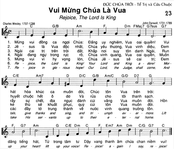 1. Mừng vui đồng ca ngợi Chúa: Đấng uy nghiêm, Vua oai quyền! Vui hát hòa khúc ca muôn đời, Chúc tôn Vua trên trời: dâng tiếng hát, Từ trong tâm tư Dậy vang thanh âm chứa chan niềm vui! 2. Jê-sus là Vua độc nhất, Chúa yêu thương, Vua vinh diệu, Đem huyết chuộc hết ô dơ Và rửa cho tôi thanh sạch. dâng tiếng hát, Từ trong tâm tư Dậy vang thanh âm chứa chan niềm vui! 3. Ngài cai trị trên trời đất, Khắp nơi suy tôn danh Ngài, Run rẩy sự chết, địa ngục đành cúi vâng Vua muôn đời. Hồn dâng tiếng hát, Từ trong tâm tư Dậy vang thanh âm chứa chan niềm vui! 4. Ngài đang ngự trong rực rỡ, Chúa vinh quang, Vua oai quyền, Muôn kẻ thù sẽ khuất phục, quỳ cúi tôn Vua muôn đời. dâng tiếng hát, Từ trong tâm tư Dậy vang thanh âm chứa chan niềm vui! 5. Mừng vui vì hy vọng lớn, Chúa Jê-sus sẽ cai trị; Đem các đầy tớ trung thành về nước vinh quang trường tồn. dâng tiếng hát, Từ trong tâm tư Dậy vang thanh âm chứa chan niềm vui!