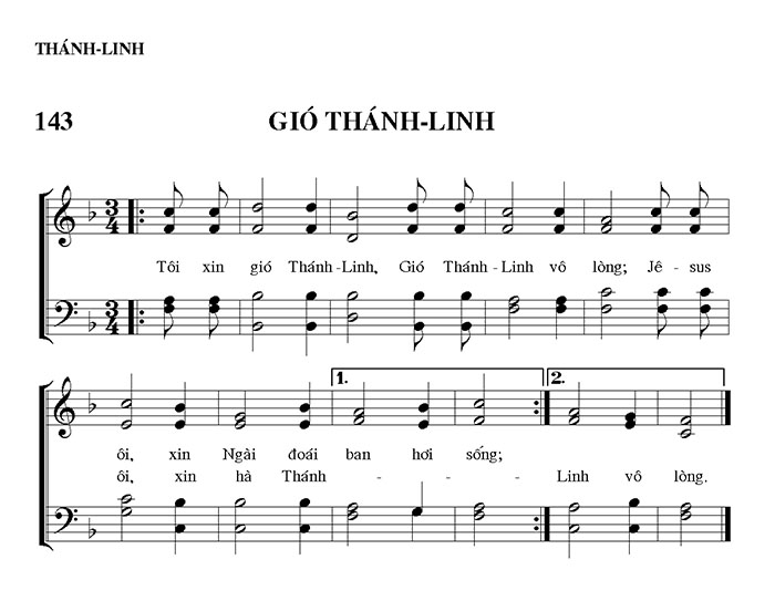 1. Tôi xin gió Thánh-Linh, Gió Thánh-Linh vô lòng; Jê-sus ôi, xin Ngài đoái ban hơi sống; 2. Tôi xin gió Thánh-Linh, Gió Thánh-Linh vô lòng; Jê-sus ôi, xin hà Thánh Linh vô lòng.