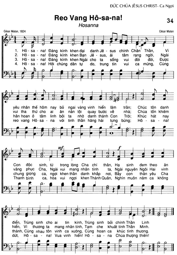 1. Hô-sa-na! Đáng kính khen đại danh Jê-sus chính Chân Thần, Vì yêu nhân thế hôm nay bỏ ngai vàng vinh hiển lâm trần; Chúc tôn danh Con độc sinh, từ trong lòng Cha chí thân, Hạ sinh đem theo ân điển, Trùng sinh cho ai tin kính, Trùng sinh bởi chính Thần Linh. 2. Hô-sa-na! Đáng kính khen Bạn Jê-sus, ái tâm rạng ngời, Ngài vui tha thứ cho ai ăn năn tội quay bước về nhà; Chúa tốn khiêm vâng phục Cha, Ngài vui mang nhân tính ta, Ngài nguyên Ngôi Hai vinh hiển, Vì thương ta mang nhân tính, Tạm che khuất tính Thần Minh. 3. Hô-sa-na! Đáng kính khen Ngài cho ta sống vui đời đời, Được hân hoan ở tâm linh bởi ta nhờ danh thánh Con Trời; Khúc hát nay chung giọng ca, ngợi khen thần danh khắp nơi, Bầy con thân yêu Cha thánh, Cùng nhau tôn vinh ca xướng, Cùng hoan ca khúc tình thương. 4. Hô-sa-na! Hỡi chúng dân tự do, trung tín vui ca mừng, Cùng reo vang Hô-sa-na với tinh thần hăng hái tưng bừng; Hô-sa-na! Thanh bình ca, hòa vui ngợi khen Thánh Quân, Nghìn muôn năm ca không dứt, Hô-sa-na! Vua vinh hiển! Hô-sa-na Chúa thượng thiên!