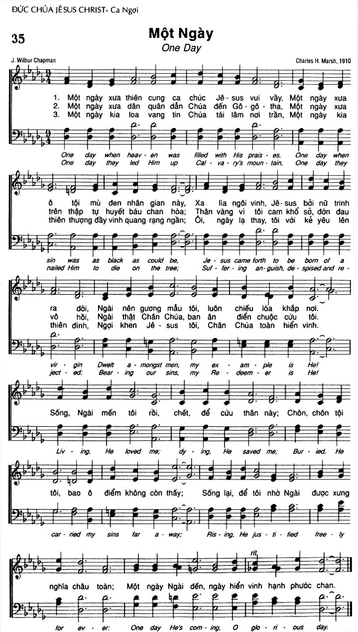 1. Một ngày xưa thiên cung ca chúc Jê-sus vui vầy, Một ngày xưa tội mù đen nhân gian này, Xa lìa ngôi vinh, Jê-sus bởi nữ trình ra đời, Ngài nên gương mẫu tôi, luôn chiếu lòa khắp nơi. Sống, Ngài mến tôi rồi, chết, để cứu thân này; Chôn, chôn tội tôi, bao ô điểm không còn thấy; Sống lại, để tôi nhờ Ngài được xưng nghĩa châu toàn; 2. Một ngày xưa dân quân dẫn Chúa đến Gô-gô-tha, Một ngày xưa trên thập tự huyết báu chan hòa; Thân vàng vì tôi cam khổ sở, đớn đau vô hồi, Ngài thật Chân Chúa, ban ân điển chuộc cứu tôi. Sống, Ngài mến tôi rồi, chết, để cứu thân này; Chôn, chôn tội tôi, bao ô điểm không còn thấy; Sống lại, để tôi nhờ Ngài được xưng nghĩa châu toàn; 3. Một ngày kia loa vang tin Chúa tái lâm nơi trần, Một ngày kia thiên thượng đầy vinh quang rạng ngần; Ôi, ngày lạ thay, tôi với kẻ yêu lên thiên đình, Ngợi khen Jê-sus tôi, Chân Chúa toàn hiển vinh. Sống, Ngài mến tôi rồi, chết, để cứu thân này; Chôn, chôn tội tôi, bao ô điểm không còn thấy; Sống lại, để tôi nhờ Ngài được xưng nghĩa châu toàn; Điệp khúc: Một ngày Ngài đến, ngày hiển vinh hạnh phước chan.