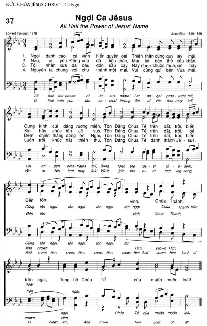 1. Ngợi danh cao cả vinh hiển quyền oai! Thiên thần cùng quỳ lạy mãi, Cung kính cúi dâng vương miện, Tôn Đấng Chúa Tể trên đất, trời, biển. Đến tôn vinh, Chúa Thánh, Cùng tôn ngợi, tôn ngợi, tôn ngợi, tôn ngợi, tôn Him, crown Him, crown Him Lord of trên ngai, Tung hô Chúa Tể của muôn muôn loài! 2. Nào, ai yêu Đấng xưa đã liều thân, Mau lại bàn thờ cầu khẩn, Xin hãy chúc tôn Jê-sus, Tôn Đấng Chúa Tể trên đất, trời, bể. Đến tôn vinh, Chúa Thánh trên Cùng tôn ngợi, tôn ngợi, tôn ngợi, tôn Him, crown Him, crown Him Lord of ngai, Tung hô Chúa Tể của muôn muôn loài! 3. Tội nhân xưa đã đau đớn sầu cay, Nay được chuộc mua, xin hãy Đem chiến thắng dâng lên Ngài, Tôn Đấng Chúa Tể trên đất, trời, biến. Đến tôn vinh, Chúa Thánh, Cùng tôn ngợi, tôn ngợi, tôn ngợi, tôn Him, crown Him, crown Him Lord of trên ngai, Tung hô Chúa Tể của muôn muôn loài! 4. Nguyền ta chung với chư thánh một mai, Vui cùng quì bên Vua mãi, Luôn trổi khúc hát thiên thu, Tôn Đấng Chúa Tể danh thánh Jê-sus. Đến tôn vinh, Chúa Thánh, Cùng tôn ngợi, tôn ngợi, tôn ngợi, tôn Him, crown Him, crown Him Lord of trên ngai, Tung hô Chúa Tể của muôn muôn loài! Điệp khúc: Đến tôn vinh, Chúa Thánh, Cùng tôn ngợi, tôn ngợi, tôn ngợi, tôn ngợi, tôn Him, crown Him, crown Him Lord of trên ngai, Tung hô Chúa Tể của muôn muôn loài!