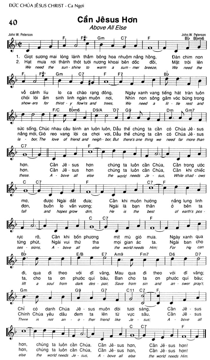 1. Giọt sương mai lóng lánh thắm bông hoa nhuộm nắng hồng, vỗ cánh líu lo ca chào rạng đông, sức sống, Chúc nhau câu bình an luôn luôn, Dẫu thế chúng ta cần có Chúa Jê-sus được Ngài dắt đưa: Cần khi bốn phương mịt mù gió mưa. di, qua đi theo với đĩ vãng, Chỉ có danh Chúa Jê-sus muôn đời tươi sáng, 2. Hạt mưa rơi thánh thót tưới nương khoai bên dốc đồi, chói lói ấm sinh linh ngàn muôn nơi, nắng mới, Gió reo vang lời ca chơi vơi, Dầu thế chúng ta cần có Chúa Jê-sus buồn lo vấn vương; Ngài vui thứ tha mọi gian ác ta. Mau qua đi theo với đĩ vãng; Chính Chúa yêu dấu đem ta lên từ vực sâu, Điệp khúc: Cần Jê-sus hơn chúng ta luôn cần Chúa, Cần trong ước mơ, Cần Jê-sus hơn chúng ta luôn cần Chúa, Cần khi chiếc đơn, Cần Jê-sus hơn chúng ta luôn cần Chúa, Cần Jê-sus hơn! Cần Jê-sus hơn chúng ta luôn cần Chúa, Cần Jê-sus hơn!
