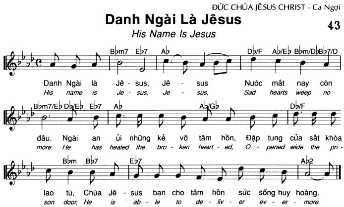 1. Danh Ngài là Jê-sus, Jê-sus, Nước mắt nay còn đâu. Ngài an ủi những kẻ vỡ tâm hồn, Đập tung cửa sắt khóa lao tù, Chúa Jê-sus ban cho tâm hồn sức sống huy hoàng.