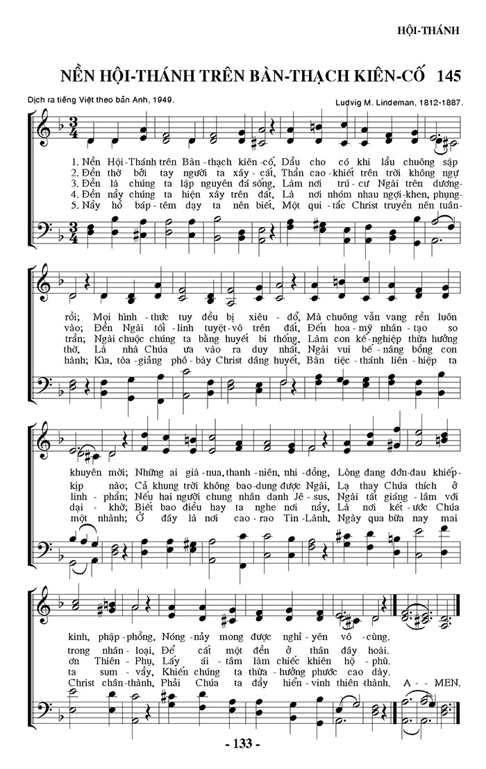 1. Nền Hội - Thánh trên Bàn - thạch kiên - cố, Dầu cho có khi lầu chuông sập rồi; Mọi hình - thức tuy đều bị xiêu - đổ, Mà chuông vẫn vang rền luôn khuyên mời; Những ai già - nua, thanh - niên, nhi - đồng, Lòng đang đớn đau khiếp - kinh, phập phồng. Nóng - nảy mong được nghỉ - yên vô cùng. 2. Đền thờ bởi tay người ta xây - cất, Thần cao - khiết trên trời không ngự vào; Đến Ngài tối - linh tuyệt - vô trên đất, Đến hoa mỹ nhân - tạo so nào; Cả khung trời không bao dung được Ngài, Lạ thay Chúa thích ở trong nhân - loại, Để cất một đền ở thân đây hoài. 3. Đền là chúng ta lập nguyên đá sống, Làm nơi trú - cư Ngài trên dương - trần; Ngài chuộc chúng ta bằng huyết bị thống, Làm con kế nghiệp thừa hưởng linh - phần; Nếu hai người chung nhân danh Jêsus, Ngài tất giáng - lâm với ơn Thiên - Phụ, Lấy ái - tâm làm chiếc khiên hộ - phù. 4. Đền nầy chúng ta hiện xây trên đất, Là nơi nhóm nhau ngợi khen, phụng - thờ, Là nhà Chúa ưa vào ra duy nhất, Ngài vui bế - nâng bồng con dai - khờ, Biết bao điều hay ta nghe nơi nầy, Là nơi kết - ước Chúa ta sum - vầy, Khiến chúng ta thừa - hưởng phước cao dày. 5. Nầy hồ báp - têm dạy ta nên biết, Một qui - tắc Christ truyền nên tuân - hành; Kìa, tòa - giảng phô - bày Christ dâng huyết, Bàn tiệc - thánh liên - hiệp ta một nhành; Ở đây là nơi cao - rao Tin - Lành, Ngày qua bữa nay mai Christ chân - thành, Phải Chúa ta đầy hiển - vinh thiên thành. A - MEN.