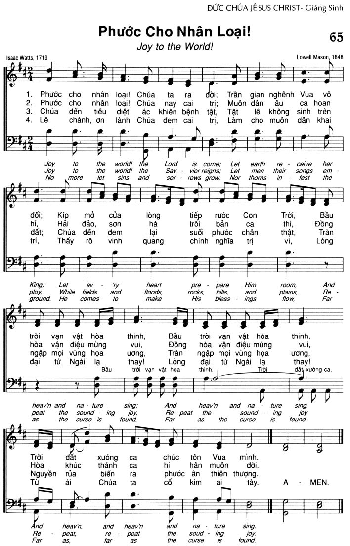 1. Phước cho nhân loại! Chúa ta ra đời; Trần gian nghênh Vua vô đối; Kíp mở cửa lòng tiếp rước Con Trời, Bầu trời vạn vật hòa thinh, Bầu trời vạn vật hòa thinh, Trời vạn vật hòa thinh, Trời đất xướng ca chúc tôn Vua mình. 2. Phước cho nhân loại! Chúa nay cai trị; Muôn dân âu ca hoan hỉ, Hải đảo, sơn hà trổi bản ca thi, Đồng hòa vận điệu mừng vui, Đồng hòa vận điệu mừng vui, Hòa vận điệu mừng vui, Hòa khúc thánh ca hi hân muôn đời. 3. Chúa đến tiêu diệt ác khiên bệnh tật, Tật lê không sinh trên đất; Chúa đến đem lại suối phước chân thật, Tràn ngập mọi vùng họa ương, Tràn ngập mọi vùng họa ương, Ngập mọi vùng họa ương, Nguyền rủa biến ra phước ân thiên thượng. 4. Lẽ chánh, ơn lành Chúa đem cai trị, Làm cho muôn dân khai trí, Thấy rõ vinh quang chính nghĩa trị vì, Lòng đại từ Ngài lạ thay! Lòng đại từ Ngài lạ thay! Lòng đại từ Ngài lạ thay! Từ ái Chúa ta cổ kim ai tày. Outro: A - MEN.
