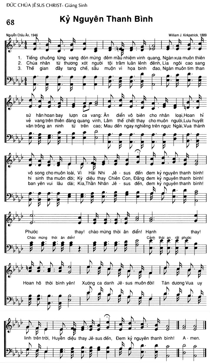 1. Tiếng chuông lừng vang đón mừng đêm mầu nhiệm vinh quang, Ngàn xưa muôn thiên sứ hân hoan bay lượn ca vang: Ân điển vô biên cho nhân loại, Hoan hỉ vô song cho muôn loài, Vì Hài Nhi Jê-sus đến đem kỷ nguyên thanh bình! 2. Chúa nhân từ thương xót người tội trầm luân lênh đênh, Lìa ngôi cao sang vẻ vang trên thiên đàng quang vinh, Lâm thế chết thay cho muôn người, Lưu huyết hi sinh tha muôn đời; Kỳ diệu thay Chiên Con, Đấng đem kỷ nguyên thanh bình! 3. Thế gian đầy tang chế, sầu muộn vì họa binh đao, Ngàn muôn tim than vẫn trông an ninh từ trên cao; Mau đến ngay nghiêng trên ngực Ngài, Vua thánh ban yên vui lâu dài; Kìa, Thần Nhân Jê-sus đến, đem kỷ nguyên thanh bình! Điệp khúc: Phước thay! chào mừng thời ân điển! Hạnh thay! Chào mừng thời ân điển! Cảnh thái an, rất phước! Hoan hô thời bình yên! Xướng ca danh Jê-sus muôn đời! Tán dương Vua uy linh trên trời, Huyền diệu thay Jê-sus đến, Đem kỷ nguyên thanh bình! A-men.