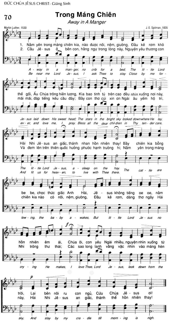 1. Nằm yên trong máng chiên kia, nào được nôi, nệm, giường, Đầu kê rơm khô thế gối, Ấu Chúa trông hiền lương, Kìa bao tinh tú trên cao đều nhìn xuống nơi này, Hài Nhi Jê-sus an giấc, thánh nhan hồn nhiên thay! Bầy chiên kia bỗng be be, chọc thức giấc Anh Hài, Jê-sus không tiếng oe oe, nằm hồn nhiên êm ái, Chúa ôi, con yêu Ngài nhiều, nguyện nhìn xuống từ trời, Lại bên nôi ru con ngủ, Cứu Chúa Jê-sus ơi! 2. Cầu Jê-sus ở bên con, hằng ngự trong lòng này, Nguyện yêu thương con mãi mãi, đáp tiếng kêu cầu đây: Bầy con thơ cúi xin ơn Ngài âu yếm hộ trì, Và đem lên trên thiên quốc hưởng phước hạnh trường hi; Năm yên trong máng chiên kia nào có nôi, nệm, giường, Đầu kê rơm, dáng thơ ngây Hài Nhi trông thư thái; Các sao long lanh vằng vặc nhìn vào máng hèn này, Hài Nhi Jê-sus an giấc, thánh thể hồn nhiên thay!