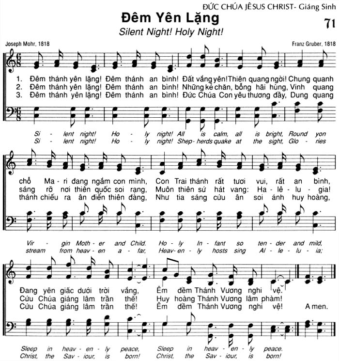 1. Đêm thánh yên lặng! Đêm thánh an bình! Đất vắng yên! Thiên quang ngời! Chung quanh chỗ Ma-ri đang ngắm con mình, Con Trai thánh rất tươi vui, rất an bình, Đang yên giấc dưới trời vắng, Êm đềm Thánh Vương nghi vệ. Cứu Chúa giáng lâm trần thế! Êm đềm Thánh Vương nghỉ vệ! A men. Sleep in heavenly peace, Christ, the Saviour, is born! 2. Đêm thánh yên lặng! Đêm thánh an bình! Những kẻ chăn, bồng hãi hùng, Vinh quang sáng rỡ nơi thiên quốc soi rạng, Muôn thiên sứ hát vang: Ha-lê-lu-gia! Huy hoàng Thánh Vương lâm phàm! Cứu Chúa giáng lâm trần thế! Êm đềm Thánh Vương nghỉ vệ! A men. Sleep in heavenly peace, Christ, the Saviour, is born! 3. Đêm thánh yên lặng! Đêm thánh an bình! Đức Chúa Con yêu thương đầy, Dung quang thánh chiếu ra ân điển thiên đàng, Như tia sáng cứu ân soi ảnh huy hoàng, Đang yên giấc dưới trời vắng, Êm đềm Thánh Vương nghi vệ. Cứu Chúa giáng lâm trần thế! Êm đềm Thánh Vương nghỉ vệ! A men. Sleep in heavenly peace, Christ, the Saviour, is born!