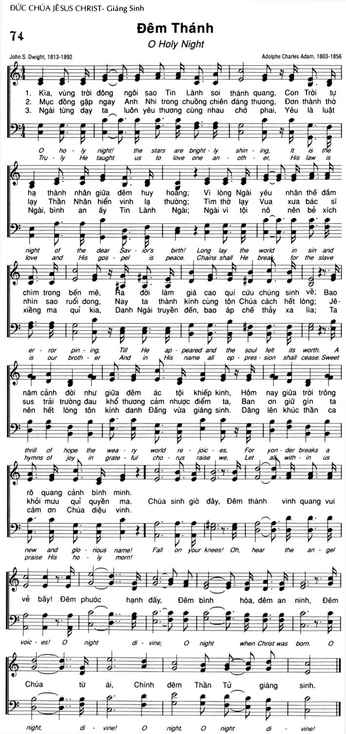 1. Kia, vùng trời đông ngôi sao Tin Lành soi thánh quang, Con Trời tự hạ thành nhân giữa đêm huy hoàng; Vì lòng Ngài yêu nhân thể đắm chìm trong bến mê, Ra đời làm giá cao quí cứu chúng sinh về; Bao năm cảnh đời như giữa đêm ác tội khiếp kinh, Hôm nay giữa trời trông rõ quang cảnh bình minh. 2. Mục đồng gặp ngay Anh Nhi trong chuồng chiên đáng thương, Đơn thành thờ lạy Thần Nhân hiển vinh lạ thường; Tìm thờ lạy Vua xưa bác Sĩ nhìn sao ruổi dong, Nay ta thành kính cùng tôn Chúa cách hết lòng; Jê-sus trải trường đau khổ thương cảm nhược điểm ta, Ban ơn giữ gìn ta khỏi mưu qui quyền ma. 3. Ngài từng dạy ta luôn yêu thương cùng nhau chó phai, Yêu là luật Ngài, bình an ấy Tin Lành Ngài; Ngài vì tội nô nên bẻ xích xiềng ma qui kia, Danh Ngài truyền đến, bao áp chế thảy xa lia; Ta nên hết lòng tôn kính danh Đấng vừa giáng sinh. Dâng lên khúc thần ca cám ơn Chúa diệu vinh. Điệp khúc: Vẻ bấy! Đêm phước hạnh đấy, Đêm bình hòa, đêm an ninh, Đêm Chúa từ ái, Chính đêm Thần Tử giáng sinh.