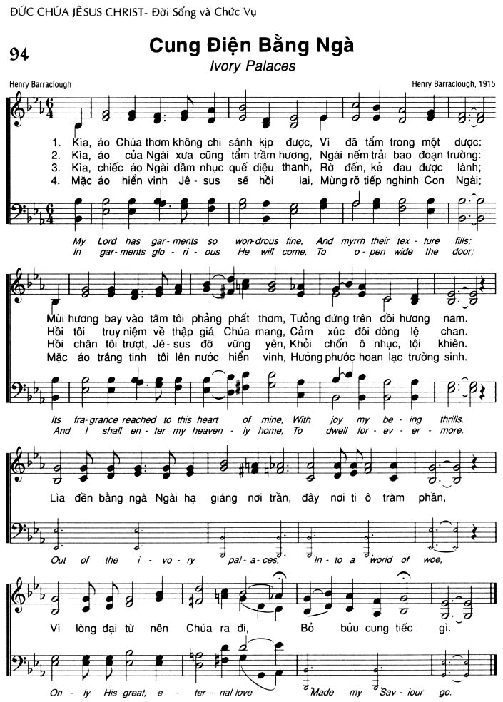 1. Kìa, áo Chúa thơm không chi sánh kịp được, Vì đã tẩm trong một dược: Mùi hương bay vào tâm tôi phảng phất thơm, Tưởng đứng trên đồi hương nam. Lìa đền bằng ngà Ngài hạ giáng nơi trần, đây nơi ti ô trăm phần, Vì lòng đại từ nên Chúa ra đi, Bỏ bửu cung tiếc gì. 2. Kìa, áo của Ngài xưa cũng tẩm trầm hương, Ngài nếm trải bao đoạn trường: Hồi tôi truy niệm về thập giá Chúa mang, Cảm xúc đôi dòng lệ chan. Lìa đền bằng ngà Ngài hạ giáng nơi trần, đây nơi ti ô trăm phần, Vì lòng đại từ nên Chúa ra đi, Bỏ bửu cung tiếc gì. 3. Kìa, chiếc áo Ngài dầm nhục quế diệu thanh, Rờ đến, kẻ đau được lành; Hồi chân tôi trượt, Jêsus đỡ vững yên, Khỏi chốn ô nhục, tội khiên. Lìa đền bằng ngà Ngài hạ giáng nơi trần, đây nơi ti ô trăm phần, Vì lòng đại từ nên Chúa ra đi, Bỏ bửu cung tiếc gì. 4. Mặc áo hiển vinh Jê sus sẽ hồi lai, Mừng rỡ tiếp nghinh Con Ngài; Mặc áo trắng tinh tôi lên nước hiển vinh, Hưởng phước hoan lạc trường sinh. Lìa đền bằng ngà Ngài hạ giáng nơi trần, đây nơi ti ô trăm phần, Vì lòng đại từ nên Chúa ra đi, Bỏ bửu cung tiếc gì.