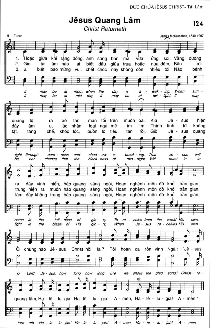 1. Hoặc giữa khi rạng đông, ánh sáng ban mai vừa ứng soi, Vầng dương quang lộ ra xé tan màn tối trên muôn loài, Kia Jêsus hiện ra đầy vinh hiển, hào quang sáng ngời, Hoan nghênh môn đồ khỏi trần gian. 2. Giờ tái lâm nào ai biết đâu giữa trưa hoặc nửa đêm, Bầu trời đầy âm u, lúc nhân loại ngủ mê im lim, Thình lình từ không trung hiện ra muôn hào quang sáng ngời, Hoan nghênh môn đồ khỏi trần gian. 3. À biết bao mừng vui, chết chóc nay không còn nhiễu tôi, Nào bệnh tật, tang chế, khóc lóc, buồn lo tiêu tan rồi, Giờ Jêsus quang lâm đầy không trung hào quang sáng ngời, Hoan nghênh môn đồ khỏi trần gian. chorus. Ôi chừng nào Jêsus Christ hồi lai? Tôi hoan ca tôn vinh Ngài: "Jêsus quang lâm, Ha-lê-lu-gia! Ha-lê-lu-gia! A-men, Ha-lê-lu-gia! A-men." Điệp khúc: Ôi chừng nào Jêsus Christ hồi lai? Tôi hoan ca tôn vinh Ngài: "Jêsus quang lâm, Ha-lê-lu-gia! Ha-lê-lu-gia! A-men, Ha-lê-lu-gia! A-men."