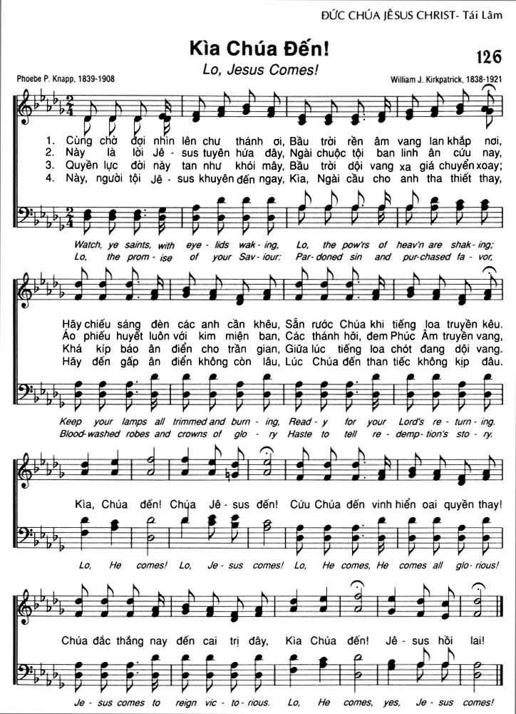 1. Cùng chờ đợi nhìn lên chư thánh ơi, Bầu trời rền âm vang lan khắp nơi, Hãy chiếu sáng đèn các anh cần khêu, Sẵn rước Chúa khi tiếng loa truyền kêu. 2. Này là lời Jêsus tuyên hứa đây, Ngài chuộc tội ban linh ân cứu nay, Áo phiếu huyết luôn với kim miện ban, Các thánh hỡi, đem Phúc Âm truyền vang, 3. Quyền lực đời này tan như khói mây, Bầu trời dội vang xa giá chuyển xoay; Khá kíp báo ân điển cho trần gian, Giữa lúc tiếng loa chót đang dội vang. 4. Này, người tội Jêsus khuyên đến ngay, Kia, Ngài cầu cho anh tha thiết thay, Hãy đến gấp ân điển không còn lâu, Lúc Chúa đến than tiếc không kịp đâu. Điệp khúc: Kìa, Chúa đến! Chúa Jêsus đến! Cứu Chúa đến vinh hiển oai quyền thay! Chúa đắc thắng nay đến cai trị đây, Kìa Chúa đến! Jêsus hồi lai!