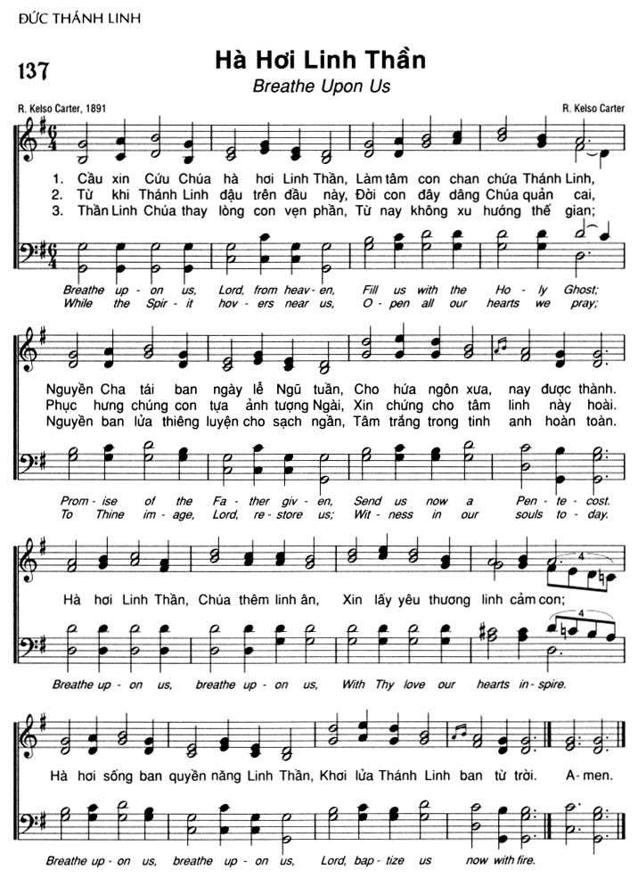 1. Cầu xin Cứu Chúa hà hơi Linh Thần, Làm tâm con chan chứa Thánh Linh, Nguyền Cha tái ban ngày lễ Ngũ tuần, Cho hứa ngôn xưa, nay được thành. 2. Từ khi Thánh Linh đậu trên đầu này, Đời con đây dâng Chúa quản cai, Phục hưng chúng con tựa ảnh tượng Ngài, Xin chứng cho tâm linh này hoài. 3. Thần Linh Chúa thay lòng con vẹn phần, Từ nay không xu hướng thế gian; Nguyền ban lửa thiêng luyện cho sạch ngần, Tâm trắng trong tinh anh hoàn toàn. 4. Hà hơi sống ban quyền năng Linh Thần, Khơi lửa Thánh Linh ban từ trời. A-men. Điệp khúc: Hà hơi Linh Thần, Chúa thêm linh ân, Xin lấy yêu thương linh cảm con;