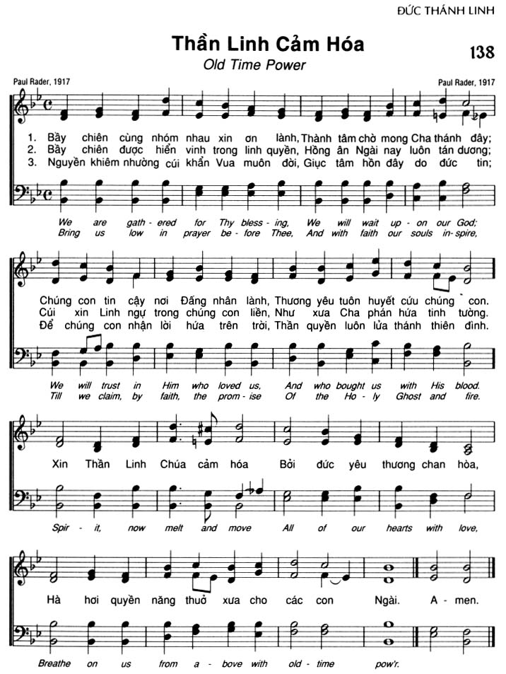1. Bầy chiên cùng nhóm nhau xin ơn lành, Thành tâm chờ mong Cha thánh đây; Chúng con tin cậy nơi Đấng nhân lành, Thương yêu tuôn huyết cứu chúng con. Xin Thần Linh Chúa cảm hóa Bởi đức yêu thương chan hòa, Hà hơi quyền năng thuở xưa cho các con Ngài. A-men. 2. Bầy chiên được hiển vinh trong linh quyền, Hồng ân Ngài nay luôn tán dương; Cúi xin Linh ngự trong chúng con liền, Như xưa Cha phán hứa tinh tường. Xin Thần Linh Chúa cảm hóa Bởi đức yêu thương chan hòa, Hà hơi quyền năng thuở xưa cho các con Ngài. A-men. 3. Nguyền khiêm nhường cúi khẩn Vua muôn đời, Giục tâm hồn đây do đức tin; Để chúng con nhận lời hứa trên trời, Thần quyền luôn lửa thánh thiên đình. Xin Thần Linh Chúa cảm hóa Bởi đức yêu thương chan hòa, Hà hơi quyền năng thuở xưa cho các con Ngài. A-men. Điệp khúc: We are gathered for Thy bless-ing, We will wait up-on our God; Bring us low in prayer be-fore Thee, And with faith our souls in-spire, We will trust in Him who loved us, And who bought us with His blood. Till we claim, by faith, the prom-ise Of the Ho-ly Ghost and fire. Spir-it, now melt and move All of our hearts with love. Breathe on us from a-bove with old-time pow'r.