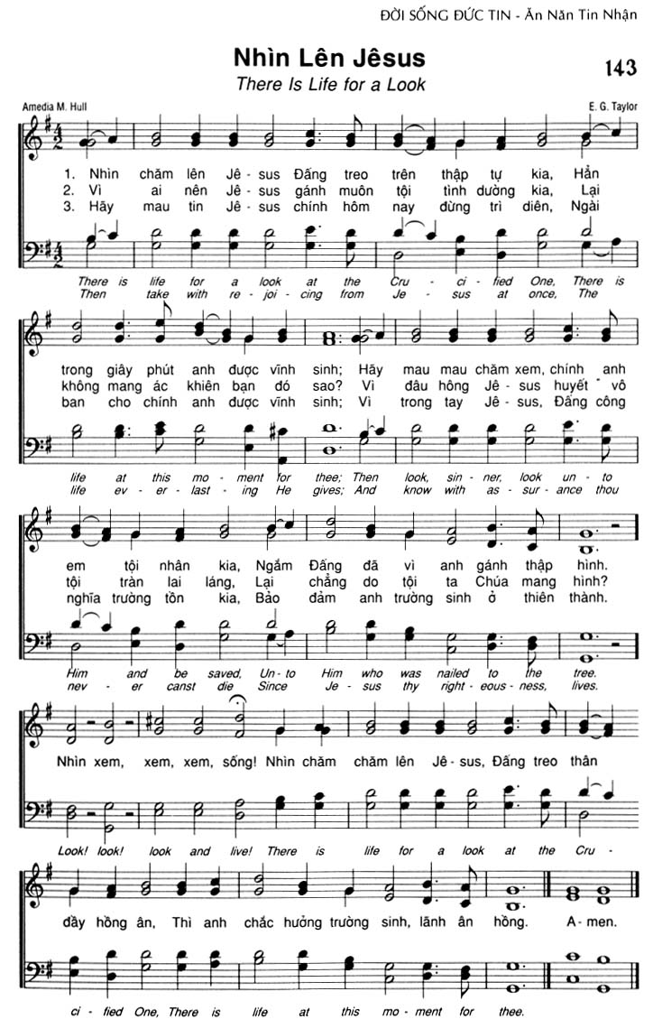 1. Nhìn chăm lên Jêsus Đấng treo trên thập tự kia, Hằn trong giây phút anh được vĩnh sinh; Hãy mau mau chăm xem, chính anh em tội nhân kia, Ngắm Đấng đã vì anh gánh thập hình. 2. Vì ai nên Jêsus gánh muôn tội tình dường kia, Lại không mang ác khiến bạn đó sao? Vì đâu hông Jêsus huyết vô tội tràn lai láng, Lại chẳng do tôi ta Chúa mang hình? 3. Hãy mau tin Jêsus chính hôm nay đừng trì diên, Ngài ban cho chính anh được vĩnh sinh; Vì trong tay Jêsus, Đấng công nghĩa trường tồn kia, Bảo đảm anh trường sinh ở thiên thành. Điệp khúc: Nhìn xem, xem, xem, sống! Nhìn chăm chăm lên Jêsus, Đấng treo thân đầy hồng ân, Thì anh chắc hưởng trường sinh, lãnh ân hồng. A-men.