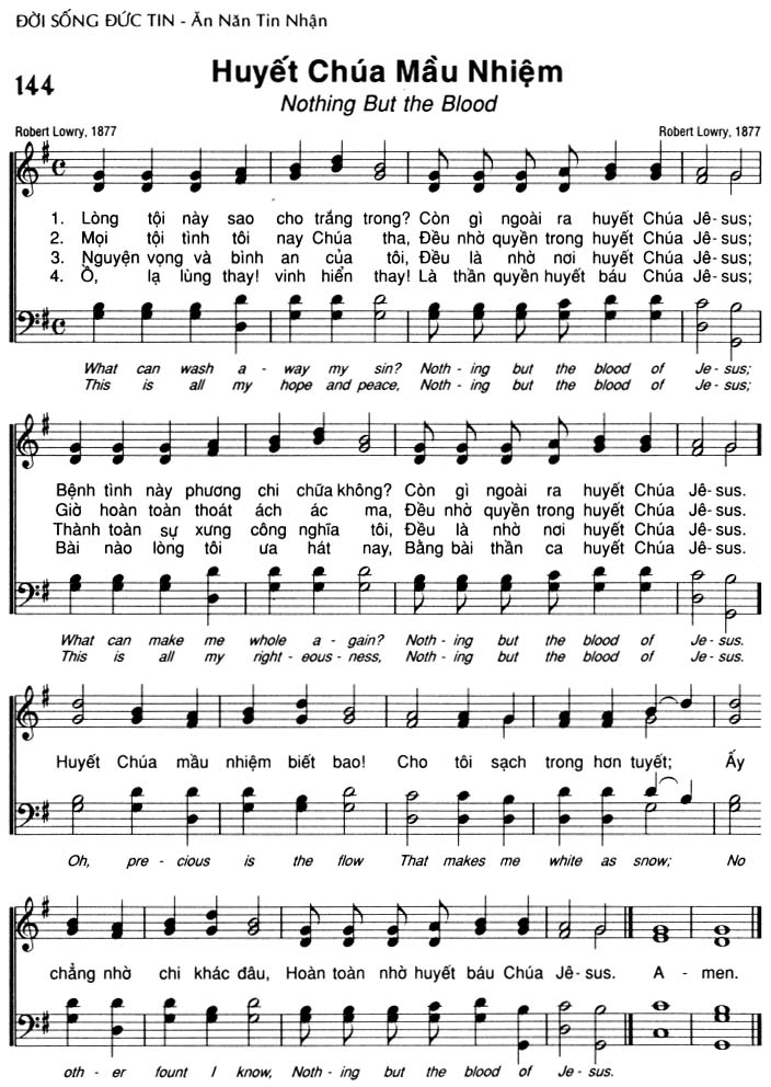1. Lòng tội này sao cho trắng trong? Còn gì ngoài ra huyết Chúa Jê-sus; Bệnh tình này phương chi chữa không? Còn gì ngoài ra huyết Chúa Jê-sus. 2. Mọi tội tình tôi nay Chúa tha, Đều nhờ quyền trong huyết Chúa Jê-sus; Giờ hoàn toàn thoát ách ác ma, Đều nhờ quyền trong huyết Chúa Jê-sus. 3. Nguyện vọng và bình an của tôi, Đều là nhờ nơi huyết Chúa Jê-sus; Thành toàn sự xưng công nghĩa tôi, Đều là nhờ nơi huyết Chúa Jê-sus. 4. Ô, lạ lùng thay! vinh hiển thay! Là thần quyền huyết báu Chúa Jê-sus; Bài nào lòng tôi ưa hát nay, Bằng bài thần ca huyết Chúa Jê-sus. Điệp khúc: Huyết Chúa mầu nhiệm biết bao! Cho tôi sạch trong hơn tuyết; Ấy chẳng nhờ chỉ khác đâu, Hoàn toàn nhờ huyết báu Chúa Jê-sus. A-men.