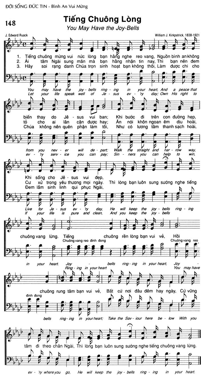 1. Tiếng chuông mừng vui nức lòng bạn hằng nghe reo vang, Nguồn bình an không biến thay do Jê-sus vui ban; Khi bước đi trên con đường hẹp, Khi sống cho Jê-sus vui đẹp, Thì lòng bạn luôn sung sướng nghe tiếng chuông vang lừng. 2. Ái tâm Ngài sung mãn mà bạn hằng nhận tin nay, Thì bạn nên đem tỏ cho ai lân cận được hay; Ăn nói khôn ngoan êm dịu hoài, Cư xử trong yêu thương mọi ngày. Thì lòng bạn luôn sung sướng nghe tiếng chuông vang lừng. 3. Hãy soi rạng danh Chúa trọn sinh hoạt bạn không thôi, Làm được chi cho Chúa không nên quên phận làm tôi, Như có lương tâm thanh sạch hoài, Đem lắm sinh linh qui phục Ngài, Thì lòng bạn luôn sung sướng nghe tiếng chuông vang lừng. en_1. You may have the joy-bells ring-ing in your heart, And a peace that from you never will depart; Walk the straight and narrow way, Live for Je-sus ev-'ry day, He will keep the joy-bells ring-ing in your heart. en_2. Let your life speak well of Je-sus ev-'ry day; Own His right to ev-'ry service you can pay; Sin-ners you can help to win, If your life is pure and clean, And you keep the joy-bells ring-ing in your heart. en_3. Take the Saviour here be-low with you ev-'ry where you go, He will keep the joy-bells ring-ing in your heart. Điệp khúc: Tiếng chuông rền lòng bạn vui vẻ, Chuông vang reo định đong. Hồi chuông vang reo. Chuông rung tâm bạn vui vẻ, Bất cứ nơi đâu đêm hay ngày, Cứ vững tâm đi theo chân Ngài, Thì lòng bạn luôn sung sướng nghe tiếng chuông vang lừng.