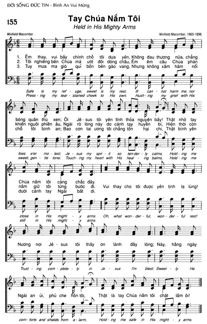 1. Êm thay, vui bấy chính chỗ tôi dựa yên, Không đau thương nữa, chẳng bóng quân thù xen; Ôi Jê-sus tôi yên tĩnh thỏa nguyện bấy! Thật nhờ tay Chúa nắm tôi càng chắc đây. Nương nơi Jê-sus tôi thấy ơn lành đầy lòng; Này, hằng ngày Ngài an ủi, phủ che hồn tôi, Thật là tay Chúa nắm tôi chặt lắm ôi! 2. Tôi nghiêng bên Chúa má ướt đôi dòng châu, Êm êm câu Chúa phán khiến nguôi phiền âu, Ngài rờ lòng này do cánh tay huyền bí, Hiện thời còn nắm giữ tôi từng bước đi. Nương nơi Jê-sus tôi thấy ơn lành đầy lòng; Này, hằng ngày Ngài an ủi, phủ che hồn tôi, Thật là tay Chúa nắm tôi chặt lắm ôi! 3. Tuy mưa ma gió quả bốn bên gào vang, Nhưng không xâm hãm nổi chỗ tôi bình an; Bao cơn tai ương tôi chẳng tổn hại chi, Thật bình yên dưới cánh tay Ngài bất di. Nương nơi Jê-sus tôi thấy ơn lành đầy lòng; Này, hằng ngày Ngài an ủi, phủ che hồn tôi, Thật là tay Chúa nắm tôi chặt lắm ôi! Điệp khúc: Vui thay cho tôi được yên tịnh lạ lùng!