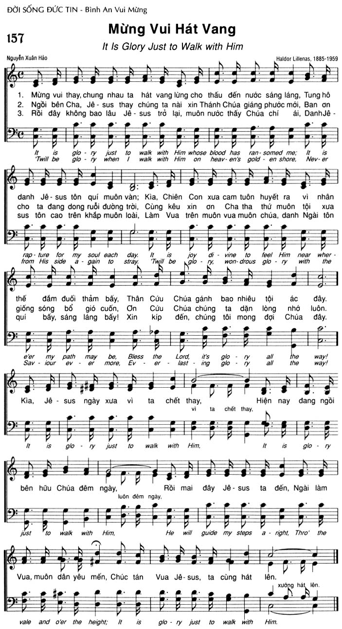 1. Mừng vui thay, chung nhau ta hát vang lừng cho thấu đến nước sáng láng, Tung hô danh Jêsus tôn quí muôn vàn; thế đắm đuối thảm bấy, Thân Cứu Chúa gánh bao nhiêu tội ác đây. Kia, Jêsus ngày xưa vì ta chết thay, Hiện nay đang ngồi bên hữu Chúa đêm ngày, Rồi mai đây Jêsus ta đến, Ngài làm Vua, muôn dân yêu mến, Chúc tán Vua Jêsus, ta cùng hát lên. 2. Ngồi bên Cha, Jêsus thay chúng ta nài xin Thánh Chúa giáng phước mới, Ban ơn cho ta đang dong ruỗi đường trời, Cùng kêu xin ơn Cha tha thứ muôn tội xưa giống sóng bổ gió cuốn, Ơn Cứu Chúa chúng ta dặn lòng nhớ luôn. vì ta chết thay, luôn đêm ngày, He will guide my steps a-right, Thro' the vale and o'er the height; 3. Rồi đây không bao lâu Jêsus trở lại, muôn nước thấy Chúa chí ái, Danh Jêsus tôn cao trên khắp muôn loài, Làm Vua trên muôn vua muôn chúa, danh Ngài tôn qui bấy, sáng láng bấy! Xin kíp đến, chúng tôi mong đợi Chúa đây. xướng hát lên. Điệp khúc: It is glory just to walk with Him whose blood has ransomed me; It is rapture for my soul each day. It is joy divine to feel Him near wher-e'er my path may be. Bless the Lord, it's glory all the way! It is glory just to walk with Him. It is glory just to walk with Him.