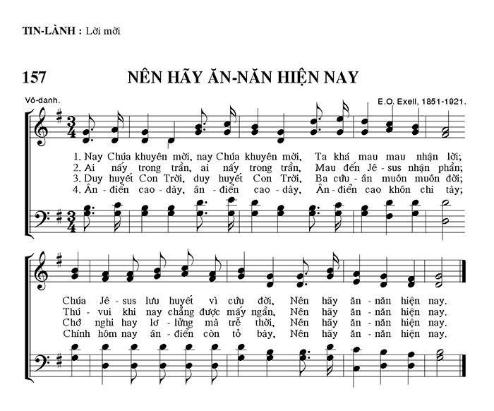 1. Nay Chúa khuyên mời, nay Chúa khuyên mời, Ta khá mau mau nhận lời; Chúa Jê-sus lưu huyết vì cứu đời, Nên hãy ăn năn hiện nay. 2. Ai nấy trong trần, ai nấy trong trần, Mau đến Jê-sus nhận phần; Thú vui khi nay chẳng được mấy ngần, Nên hãy ăn năn hiện nay. 3. Duy huyết Con Trời, duy huyết Con Trời, Ba cứu ân muôn muôn đời; Chớ nghi hay lơ lửng mà trễ thời, Nên hãy ăn năn hiện nay. 4. Ân - điển cao dày, ân - điển cao dày, Ân - điển cao khôn chi tày; Chính hôm nay ân điển còn tỏ bày, Nên hãy ăn năn hiện nay.