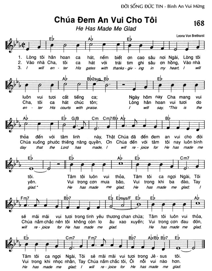 1. Lòng tôi hân hoan ca hát, nếm biết ơn cao sâu nơi Ngài, Lòng tôi luôn vui tươi cất tiếng ca; Ngày hôm nay Cha mang vui thỏa đến với tâm linh này, Thật Chúa đã đến đem an vui cho đời tôi. Tâm tôi luôn vui thỏa, Tâm tôi ca ngợi Ngài, Tôi sẽ mãi mãi vui tươi trong tình yêu thương chan chứa; Tâm tôi luôn vui thỏa, Tâm tôi ca ngợi Ngài, Tôi sẽ mãi mãi vui tươi trong Jê-sus tôi. 2. Vào nhà Cha, tôi ca hát với trái tim ghi sâu ơn hồng, Vào nhà Cha, tôi ca hát chúc tôn; Lòng hân hoan vui tươi do Chúa xuống phước thiêng nâng quyền, Ơn Chúa đến với tâm tôi nay luôn bình yên. Vui trong cơn mưa bão, Vui trong khi ba đào, Tay Chúa nắm chắc nên tôi không còn lo âu xao xuyến; Vui trong cơn đau đớn, Vui trong khi nhọc nhằn, Tay Chúa nắm chắc tôi, Ôi nỗi vui nào hơn. 3. I will enter His gates with thanksgiving in my heart, I will enter His courts with praise. I will say, "This is the day that the Lord has made, I will rejoice for He has made me glad." He has made me glad, He has made me glad; I will rejoice for He has made me glad. He has made me glad, He has made me glad; I will rejoice for He has made me glad.
