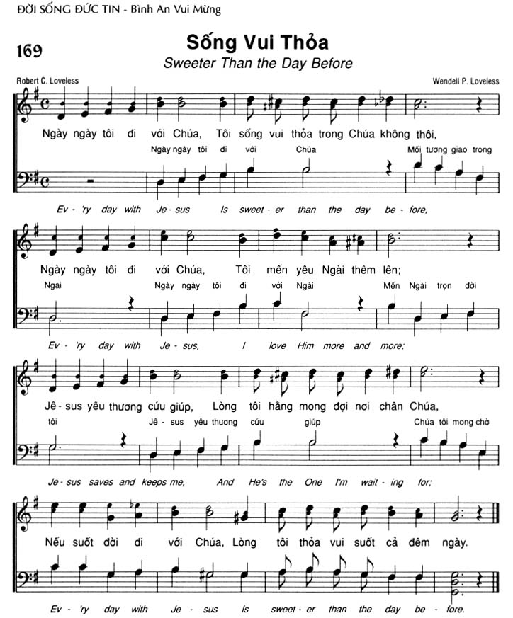 1. Ngày ngày tôi đi với Chúa, Tôi sống vui thỏa trong Chúa không thôi, Mỗi tương giao trong Ngài. Ngày ngày tôi đi với Chúa, Tôi mến yêu Ngài thêm lên; Mến Ngài trọn đời. Jê-sus yêu thương cứu giúp, Lòng tôi hằng mong đợi nơi chân Chúa, Chúa tôi mong chờ. Nếu suốt đời đi với Chúa, Lòng tôi thỏa vui suốt cả đêm ngày. 2. Ngày ngày tôi đi với Chúa, Tôi sống vui thỏa trong Chúa không thôi, Mỗi tương giao trong Ngài. Ngày ngày tôi đi với Ngài, Tôi mến yêu Ngài thêm lên; Mến Ngài trọn đời. Jê-sus yêu thương cứu giúp, Lòng tôi hằng mong đợi nơi chân Chúa, Chúa tôi mong chờ. Nếu suốt đời đi với Chúa, Lòng tôi thỏa vui suốt cả đêm ngày. 3. Ngày ngày tôi đi với Chúa, Tôi sống vui thỏa trong Chúa không thôi, Mỗi tương giao trong Ngài. Ngày ngày tôi đi với Ngài, Tôi mến yêu Ngài thêm lên; Mến Ngài trọn đời. Jê-sus yêu thương cứu giúp, Lòng tôi hằng mong đợi nơi chân Chúa, Chúa tôi mong chờ. Nếu suốt đời đi với Chúa, Lòng tôi thỏa vui suốt cả đêm ngày.