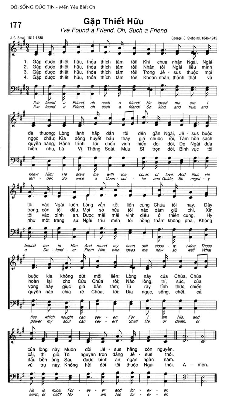1. Gặp được thiết hữu, thỏa thích tâm tôi! Khi chưa nhận Ngài, Ngài đà thương; Lòng lành hấp dẫn tôi đến gần Ngài, Jê-sus buộc tôi vào Ngài luôn. Lòng vẫn kết liên cùng Chúa tôi nay, Dây buộc kia không dứt mối liên; Lòng này của Chúa, Chúa của lòng này, Muôn đời Jê-sus hằng còn nguyên. 2. Gặp được thiết hữu, thỏa thích tâm tôi! Nhân tôi Ngài liều mình ngọc châu; Kia dòng huyết báu thay giá chuộc rồi, Tâm hồn sạch trong, còn tội tôi đâu. Mọi sở hữu tôi nào dám giữ chi, Xin hoàn lại cho Cứu Chúa tôi; Nào lòng, trí, sức, của cải, thì giờ, Tôi nguyện trọn dâng Jê-sus thôi. 3. Gặp được thiết hữu, thỏa thích tâm tôi! Trong Jê-sus thuộc mọi quyền năng, Hành trình tới chốn vinh hiển đời đời, Do Ngài đưa tôi vào bình an. Được mãi mãi vinh diệu ở thiên cung, Hy vọng này giục giá bản tâm; Từ rày tinh thức, chiến đấu bền lòng, Sau được bình an ngàn ngàn năm. 4. Gặp được thiết hữu, thỏa thích tâm tôi! Khoan nhân, thành thật và hiền nhu, Là Vị Thống Soái, Mưu Sĩ trọn đời, Binh vực tôi như một trạng sư. Ngài tríu mến tôi nồng thắm không phai, Không quyền nào chia rẽ Chúa, tôi: Địa ngục, sống, chết, cả vũ trụ này, Không hề! đời tôi thuộc Ngài thôi. A-men.