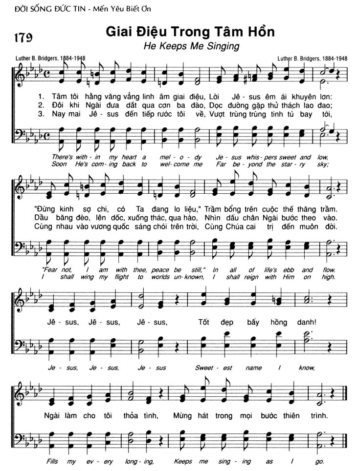 1. Tâm tôi hằng văng vẳng linh âm giai điệu, Lời Jêsus êm ái khuyên lơn: "Đừng kinh sợ chi, có Ta đang lo liệu," Trầm bổng trên cuộc thế thăng trầm. 2. Đôi khi Ngài đưa dắt qua cơn ba đào, Dọc đường gặp thử thách lao đao; Dầu băng đèo, lên dốc, xuống thác, qua hào, Nhìn dấu chân Ngài bước theo vào. 3. Nay mai Jêsus đến tiếp rước tôi về, Vượt trùng trùng tinh tú bay tới, Cùng nhau vào vương quốc sáng chói trên trời, Cùng Chúa cai trị đến muôn đời. Điệp khúc: Jêsus, Jêsus, Jêsus, Tốt đẹp bấy hồng danh! Ngài làm cho tôi thỏa tình, Mừng hát trong mọi bước thiên trình.